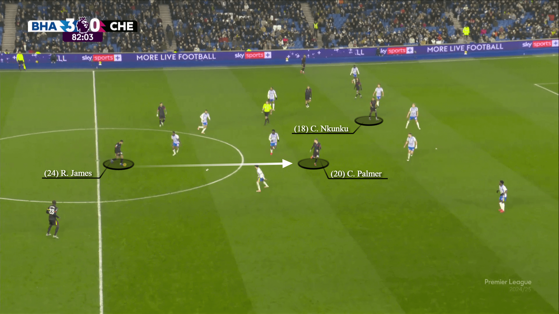 وشهدت الشوط الثاني تشيلسي في السيطرة على الحيازة مع برايتون 2-0 (ثم 3-0) أعلى. شارك بالمر بشكل أكثر نشاطًا ، لا سيما مع وصول البديل جيمس ، الذي احتل لاعبي خط الوسط في برايتون أفضل من غوستو ولعب المزيد من التمريرات في الخط ، مثل هذا واحد من الدقيقة 83.