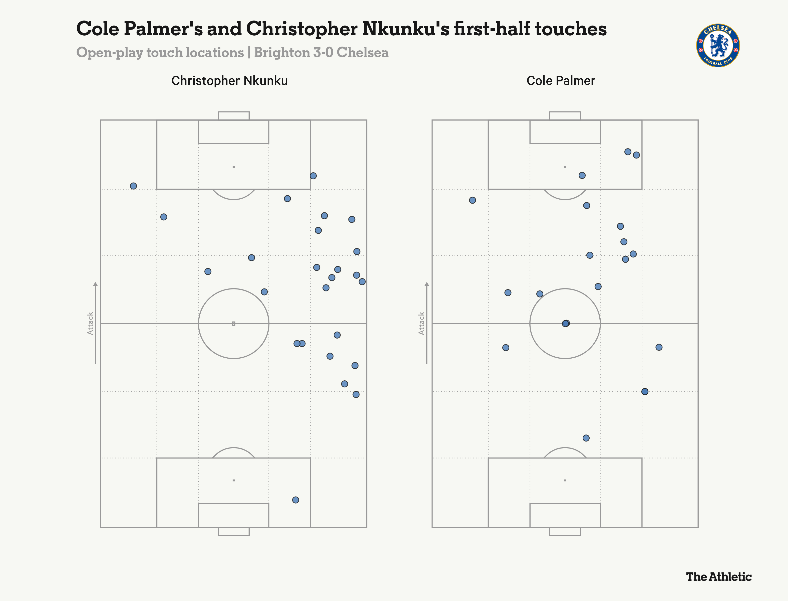مجتمعين Nkunku و Palmer مع ثلاث لمسات فقط في منطقة ركلة جزاء برايتون و 12 في نصفهم في أول 45 دقيقة. لم يحصلوا على طريق بعضهم البعض لكنهم لم يدعوا بعضهم البعض يزدهرون أيضًا.