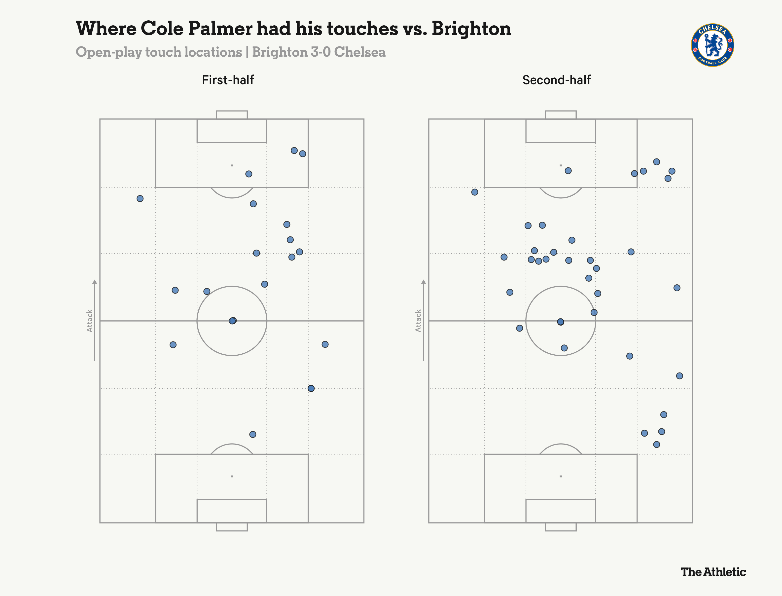على الرغم من تورطه المتزايد ، فقد بالمر حيازته 12 مرة في الشوط الثاني ، وهو ثالث أسوأه في نصف مباراة في الدوري الإنجليزي الممتاز هذا الموسم. كما تظهر خريطة اللمس أدناه ، احتاج تشيلسي إلى الانخفاض بعمق وعندما تقدم ، لم يكن لديه الكثير للعمل معه.
