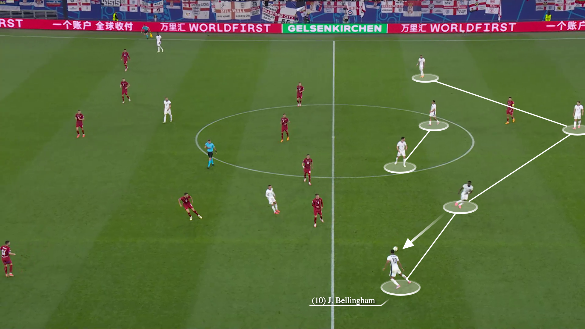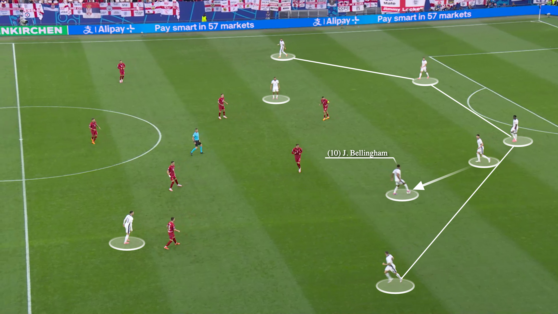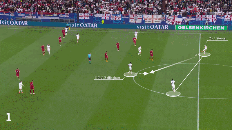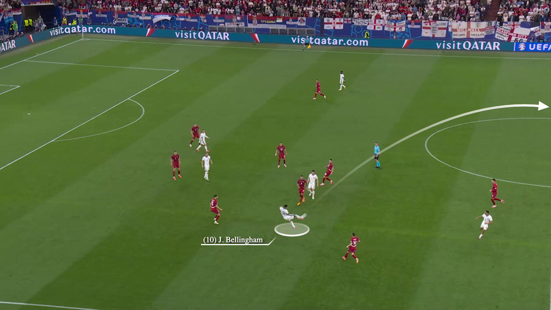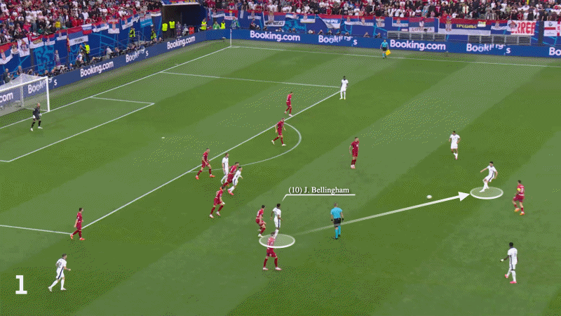 رأينا أيضًا أن بيلينجهام يتراجع إلى مركز الظهير الأيسر لاستلام الكرة خارج الكتلة الدفاعية لصربيا قبل أن يبدأ سلسلة هجوم أخرى.