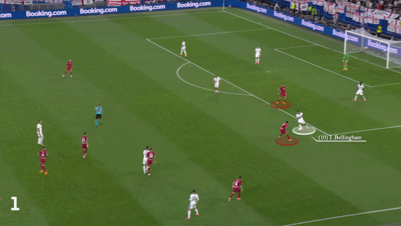 في غضون 30 ثانية من بداية المباراة، كان من الواضح أن بيلينجهام حصل على رخصة النزول إلى المناطق العميقة لجمع – آسف، السيطرة – الاستحواذ عندما تلقى الكرة من ديكلان رايس في بناء اللعب الإنجليزي.