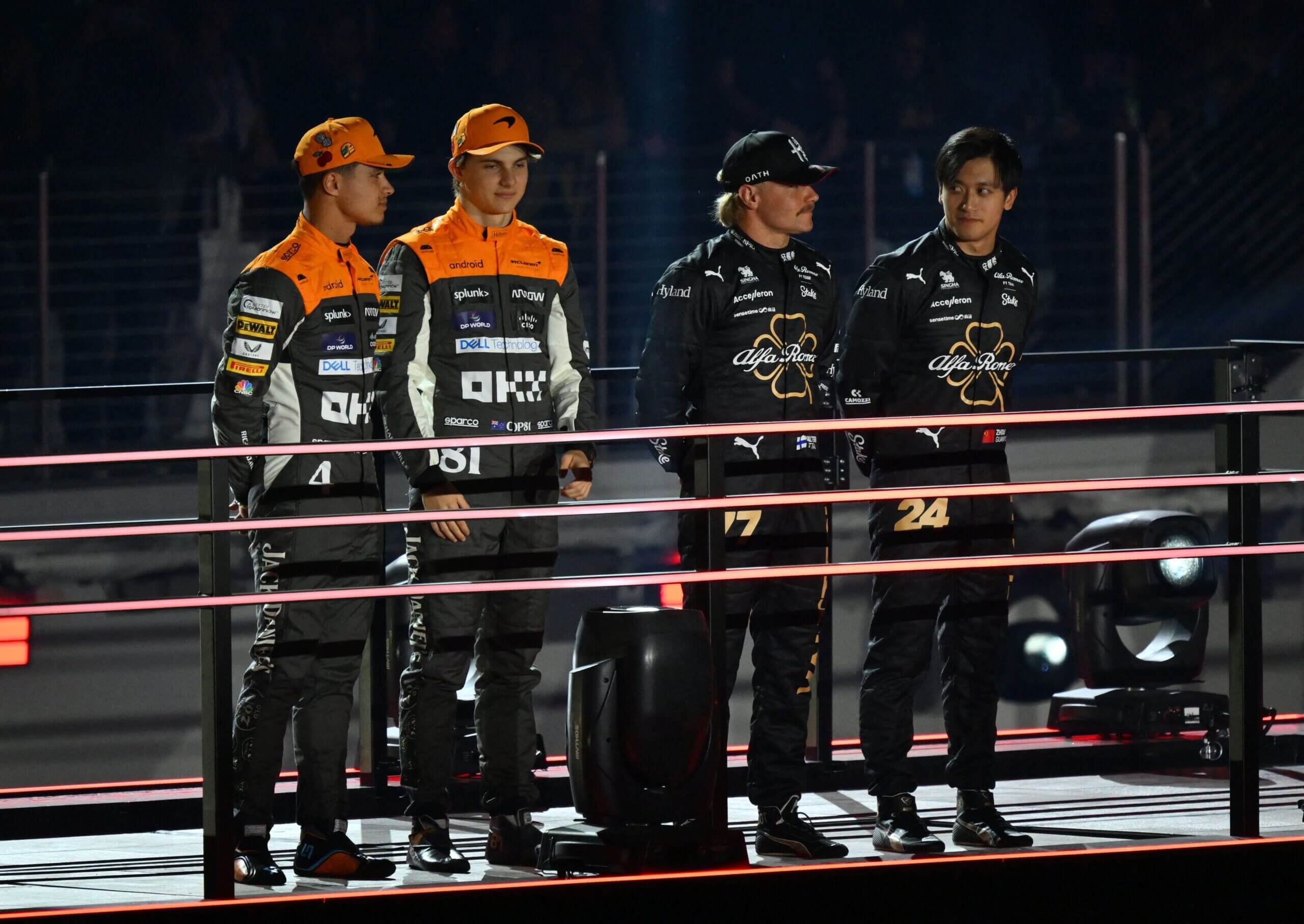 لاندو نوريس، أوسكار بياستري، فالتيري بوتاس تشو جوانيو يشاركون في حفل افتتاح سباق الجائزة الكبرى في لاس فيغاس. (أنجيلا فايس/ وكالة الصحافة الفرنسية عبر غيتي إيماجز)