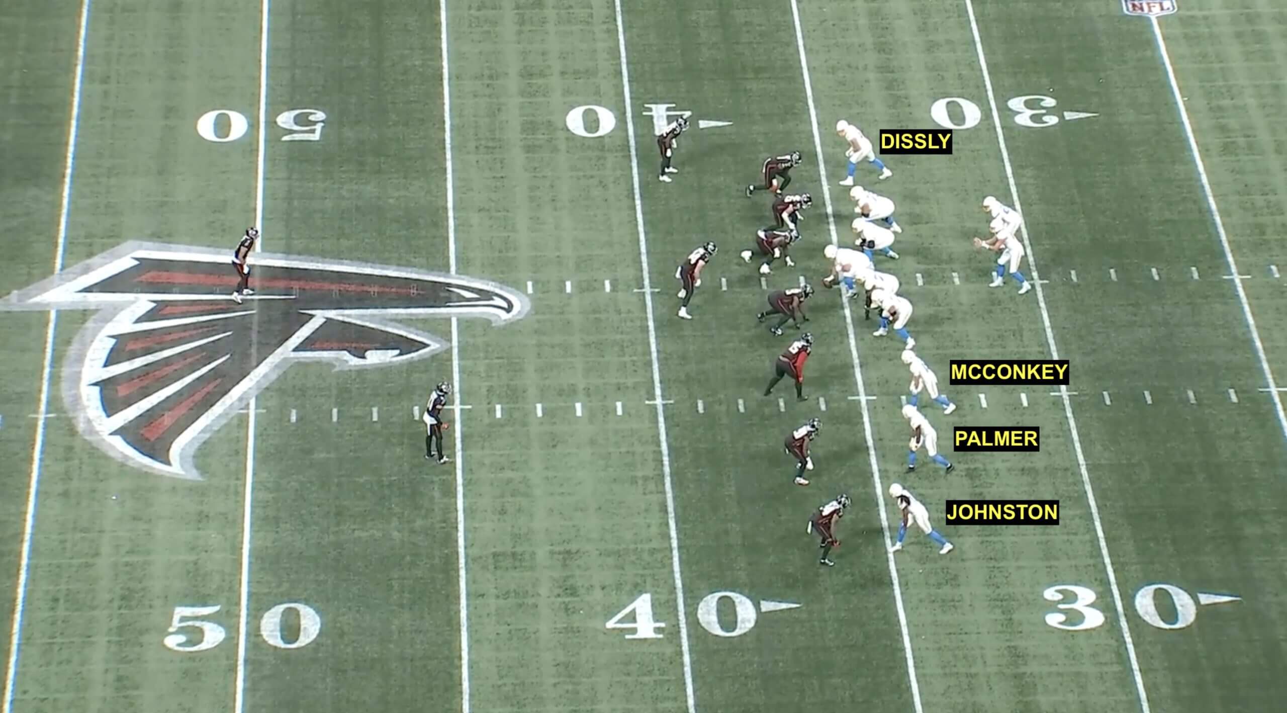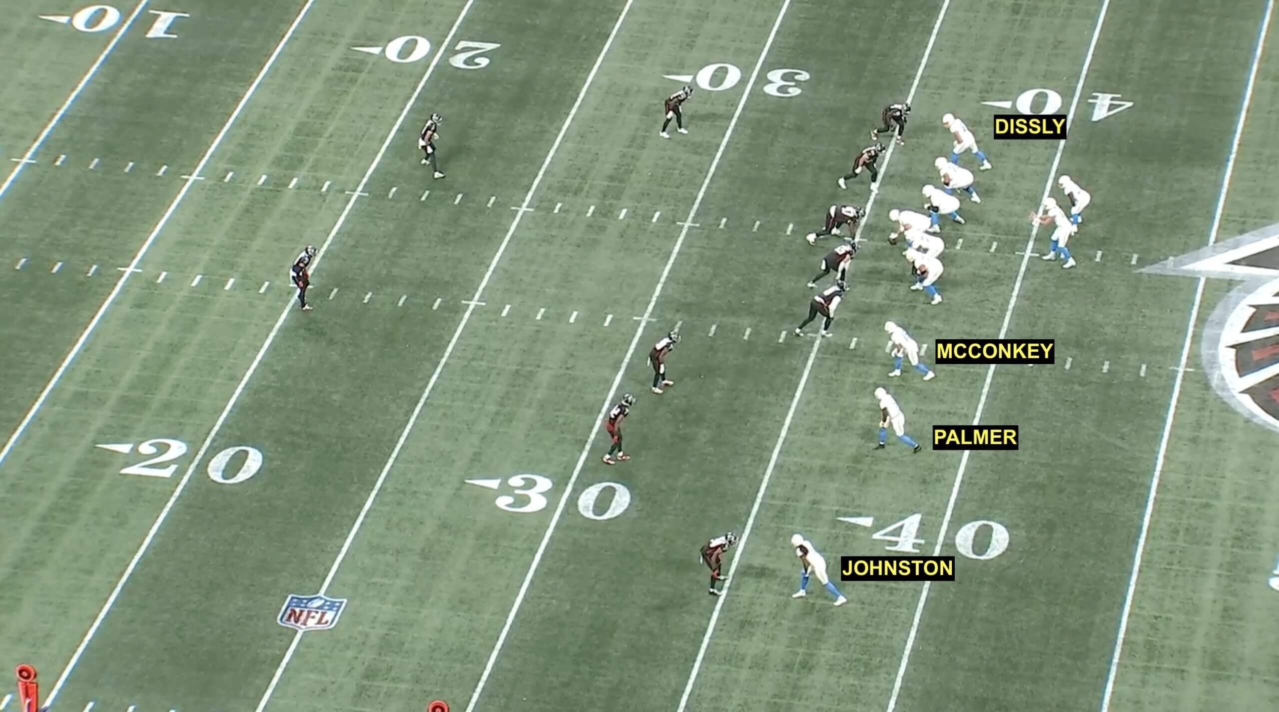 تمت محاذاة أجهزة الشحن مع ثلاثة أجهزة استقبال على اليسار. كان كوينتين جونستون هو المتلقي الخارجي. كان جوشوا بالمر داخل جونستون. وكان ماكونكي داخل بالمر. نهاية ضيقة تم عزل Will Dissly منفصلاً عن التشكيل إلى الجانب الأيمن.