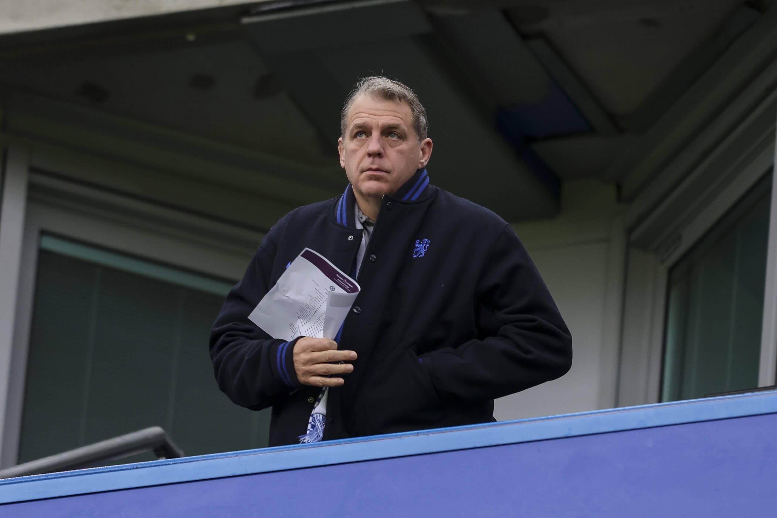 المالك المشارك لتشيلسي، تود بوهلي، يشاهد من صندوق الشركة (Robin Jones/Getty Images)