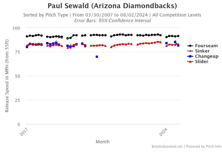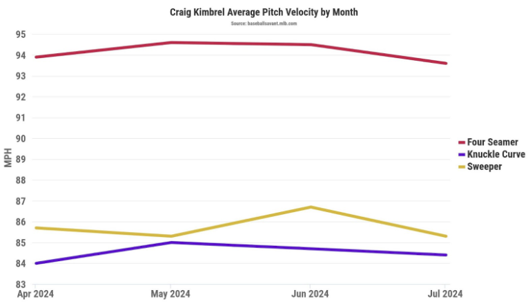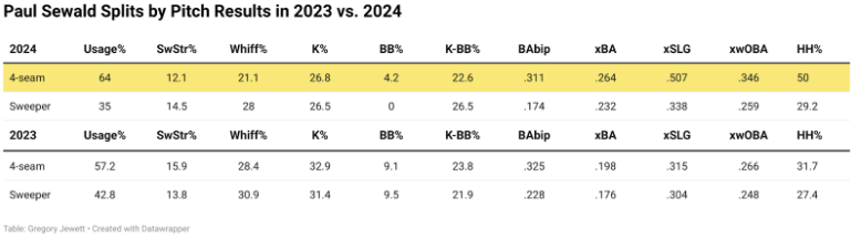 على الرغم من انخفاض السرعة، فإنه يرمي الكرة السريعة ذات الدرزات الأربع أكثر هذا العام مقارنة بعام 2023: