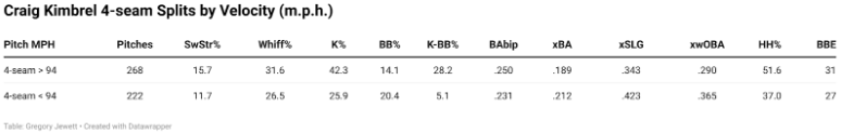 ولنأخذ الأمر خطوة أبعد، فإليك تقسيماته باستخدام سرعة 94 ميلاً في الساعة كدليل لنا، مع النتائج على الكرات السريعة ذات الأربع طبقات أعلى وأسفل من هذه السرعة لهذا العام: