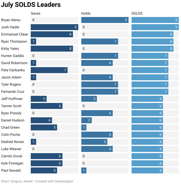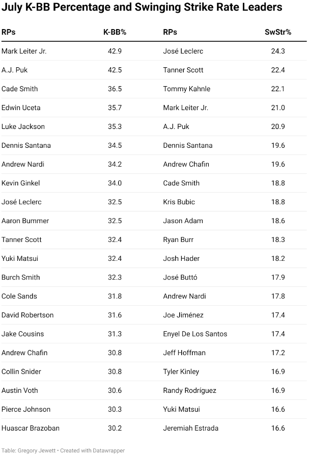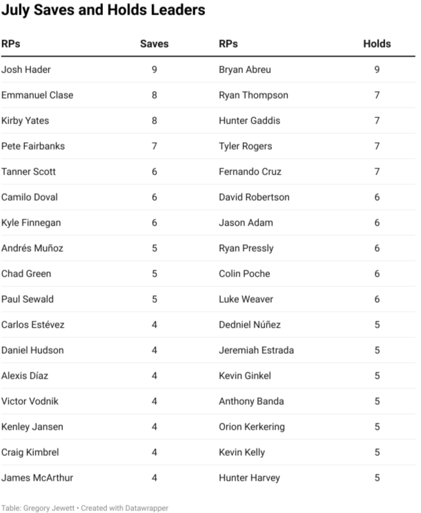 *لاعبو الإغاثة الذين يلعبون أدوارًا متعددة أو يلعبون في تقاطعات ويستطيعون استغلال الانتصارات والمساعدة في حماية النسب. يتمتع جميع لاعبي الإغاثة المدرجين بمتوسط WHIP أقل من واحد، وSIERA أقل من 2.75، ونسبة K-BB أعلى من 20، ونسبة ضربات أعلى من 66 بالمائة، ومعدل ضربات متأرجحة أعلى من 15 بالمائة خلال شهر يوليو: