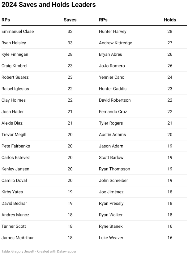 - كانساس سيتي رويالز:قدم جيمس ماك آرثر نسبة WHIP مرتفعة بلغت 1.73 في يوليو/تموز بينما نجح في تحويل أربع من خمس فرص إنقاذ على مدار 8.2 جولة. كما سمح بهدف واحد على الأقل في أربع من ثماني مباريات. وأضاف الفريق هانتر هارفي ولوكاس إيرسيج لتعزيز خط دفاع الفريق، وقد تظهر فرص إنقاذ سلسة ما لم يتحسن ماك آرثر في أغسطس/آب.