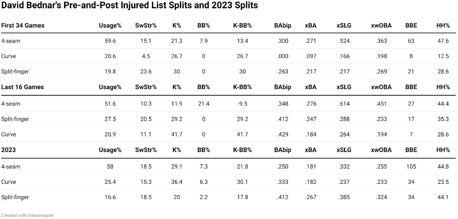 ديفيد بيدنار (PIT): على الرغم من أنه لم يكن الرامي الوحيد الذي عانى خلال خسارة الأربعاء أمام فريق الأشبال، إلا أنني أركز عليه بناءً على دوره كلاعب إغلاق. فقد سمح بثلاث ضربات وخمسة أشواط مكتسبة ومرتين (واحدة متعمدة) خلال خسارته السابعة وسادس إنقاذ فاشل. وقد لوحظ سابقًا في تلخيصاتي أنه عانى منذ عودته من إصابته المائلة خلال الموسم. ففي مبارياته الـ16 منذ 12 يوليو، سجل أربع خسائر بينما نجح في تحويل سبع من 10 فرص إنقاذ مع نسبة WHIP 2.04 على مدار 15.2 جولة. وفي ظل وجوده بين المطرقة والسندان، يجب على مديره أن يقرر كيفية نشره خلال الأسابيع الأربعة الأخيرة، مع وضع وظيفته أيضًا على المحك. وفيما يلي مخطط تقسيماته المحدثة حسب الملعب، والذي يعرض نتائجه قبل وبعد وقته في قائمة المصابين، بالإضافة إلى نتائج العام الماضي للمقارنة: