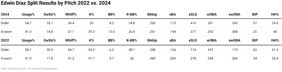 إدوين دياز (نيويورك ميتس): بعد فشله في إنقاذ فريقه في أريزونا، اقترح لاعب الإغلاق في فريق ميتس أن آليات التمرير الخاصة به “غير صحيحة”، وأنه يهبط بالقرب من القاعدة الثالثة، تاركًا تمريرته في منطقة الضربات. إن توقع نفس نتائج عام 2022 للاعب الإغلاق سيكون غير واقعي. ومع ذلك، فقد أنتجت تمريراته المنزلقة عددًا أقل بنسبة 20 في المائة من الضربات (وفقًا لـ Statcast) هذا الموسم. وعلى الرغم من انخفاض نسبة ضرباته القوية، إلا أنه سمح بخمسة أشواط منزلية على أرض الملعب مقارنة بواحدة في عام 2022. هناك وقت لإنهاء قوي، ولكن الوقت قد ينفد في الدفع نحو ما بعد الموسم. فيما يلي تقسيماته حسب الملعب هذا العام مقابل عام 2022: