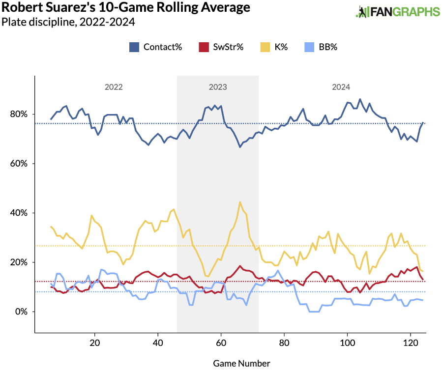 روبرت سواريز (SD): يعتقد المرء أن جزءًا من سبب قيام Padres ببناء “قلم خارق” في الموعد النهائي للتداول كان عزل عبء العمل عن أقربها، روبرت سواريز. كل جولة رمى هذا العام تضاف إلى أعلى مستوى في مسيرته بالفعل وهو 53 جولة. يوم الأربعاء، عانى من خسارة خارج الملعب، وهي ثالث ظهور له في أربعة أيام. لقد سمح بجولة في ظهوريه الماضيين وخمس مباريات من 11 مباراة في أغسطس. سيعود متوسطه المتضخم في الضرب على الكرات في اللعب (BABIP) إلى طبيعته، ولكن يجب على مديري الخيال ملاحظة نسبة WHIP 1.36 ونسبة K-BB 13 خلال 10.1 جولة هذا الشهر. والخبر السار هو أن نسبة SIERA 3.00 أقل من نسبة ERA 4.35، ولكن سيكون الاتصال الأقل موضع تقدير حتى نهاية الموسم، إلى جانب عمل أقل قليلاً في المباريات غير المحفوظة مثل تلك التي سجلها يوم الاثنين. فيما يلي مخطط لعبته المتغيرة، مع التركيز على انخفاض معدل الضربات القاضية وزيادة الاتصال المسموح به: