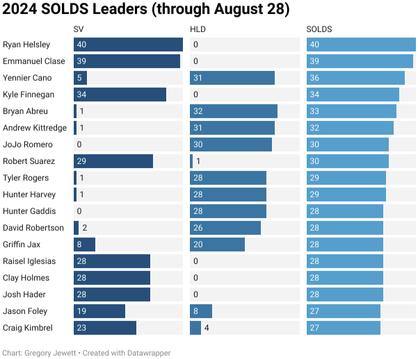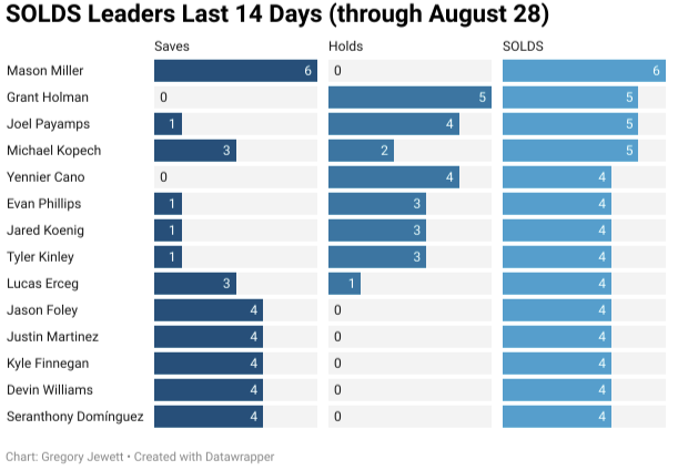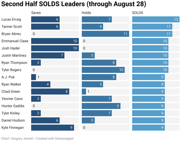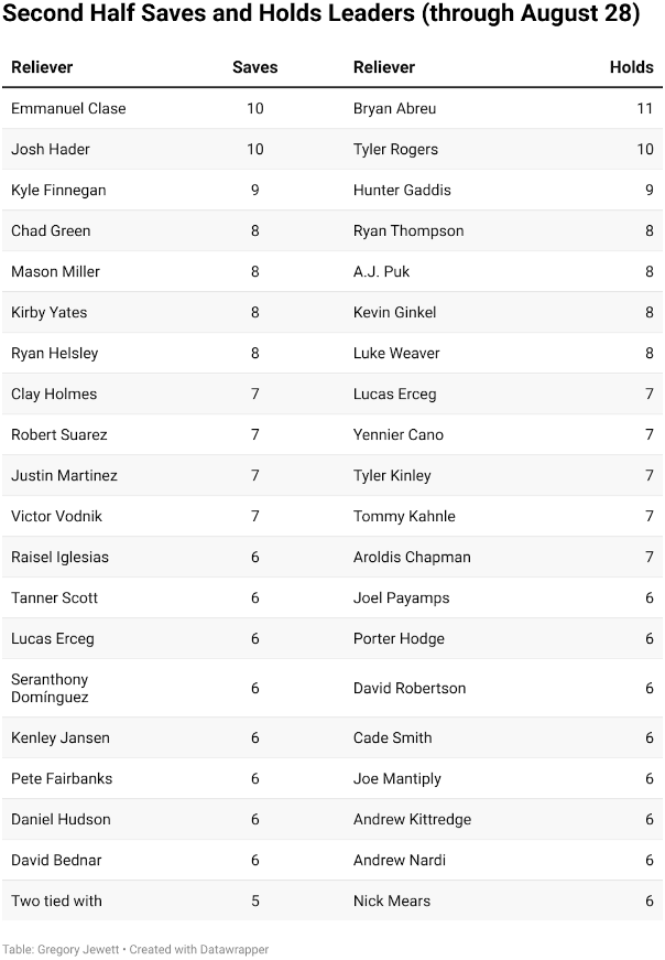 *لاعبو الإغاثة الذين يلعبون أدوارًا متعددة أو يلعبون في وضع الجسر والذين يستطيعون استغلال الانتصارات والمساعدة في حماية النسب. يتمتع جميع لاعبي الإغاثة المدرجين بـ WHIP أقل من واحد، وSIERA أقل من 2.75، ونسبة K-BB أعلى من 20، ونسبة ضربات أعلى من 66 بالمائة، ومعدل ضربات متأرجحة أعلى من 15 بالمائة في النصف الثاني:
