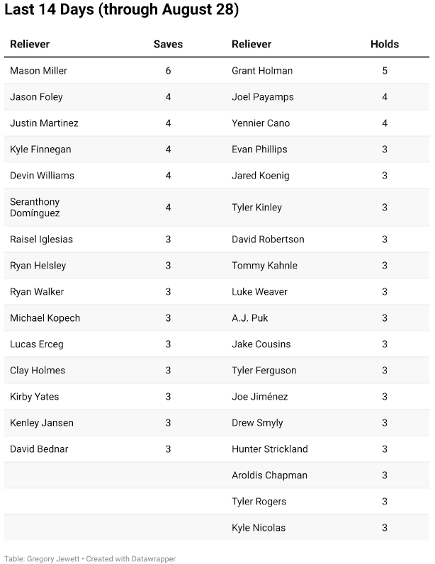 في خضم أيام الصيف الحارة وزيادة أعباء العمل مع ارتفاع حرارة سباقات ما بعد الموسم، أصبحت النتائج عالية التأثير أكثر تدقيقًا وجوهرية في تأثيرها على الترتيب. وعلى الرغم من أن بعض الأدوار لا تزال متغيرة، إلا أن المواقف الأخيرة المتغيرة قد تكون مستقرة. برز مانويل رودريجيز كخيار إنقاذ أساسي لتامبا باي، حيث سجل إنقاذًا في اثنتين من مبارياته الأربع الماضية. حل تايلر كينلي محل فيكتور فودنيك المصاب (العضلة ذات الرأسين) بطريقة روكيز النموذجية، حيث ضمن إنقاذًا في مباراة نظيفة ولم يسجل خروجًا في ظهوره في اليوم التالي. يظل كينلي خيار الإنقاذ المفضل للمضي قدمًا، فقط قم بوزن نسبة المخاطر التي يمثلها الرامي البديل في كورز.