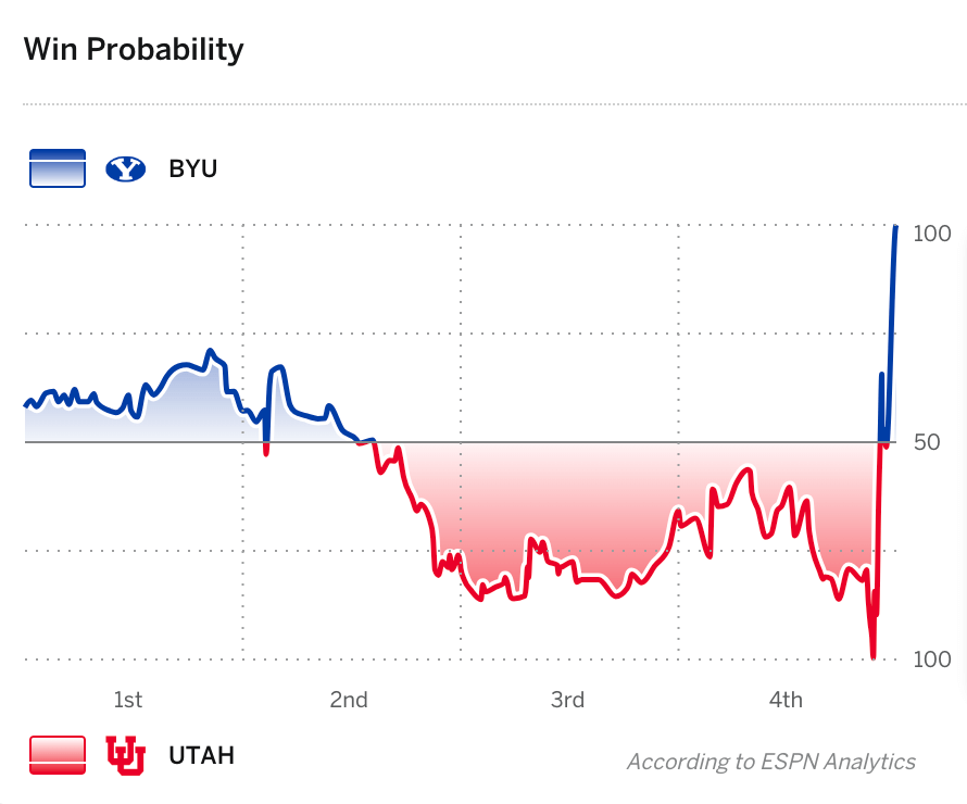🤯🤯🤯🤯 لكن النهاية الغريبة النهائية تذهب إلى رقم 9 BYU الذي يؤخر فوز يوتا 22-21. بدا فريق Utes وكأنهم يملكون المباراة في الحقيبة، حيث ضغطوا على Cougars QB Jake Retzlaff في عمق منطقة BYU وأقالوه في المركزين الرابع والعاشر. لكن BYU حصلت على أول هبوط من مكالمة Utes واستفادت لتأخذ زمام المبادرة في هدف ميداني بمسافة 44 ياردة. يوتا انتقد مارك هارلان مسؤولي Big 12 بعد ذلك قائلاً “اللعبة سُرقت منا تمامًا”. ما عليك سوى إلقاء نظرة على احتمالية فوز الكوجر في أواخر الشوط الثاني، وستفهم سبب سعادتنا بعودة التنافس في الحرب المقدسة كمسألة مؤتمر.