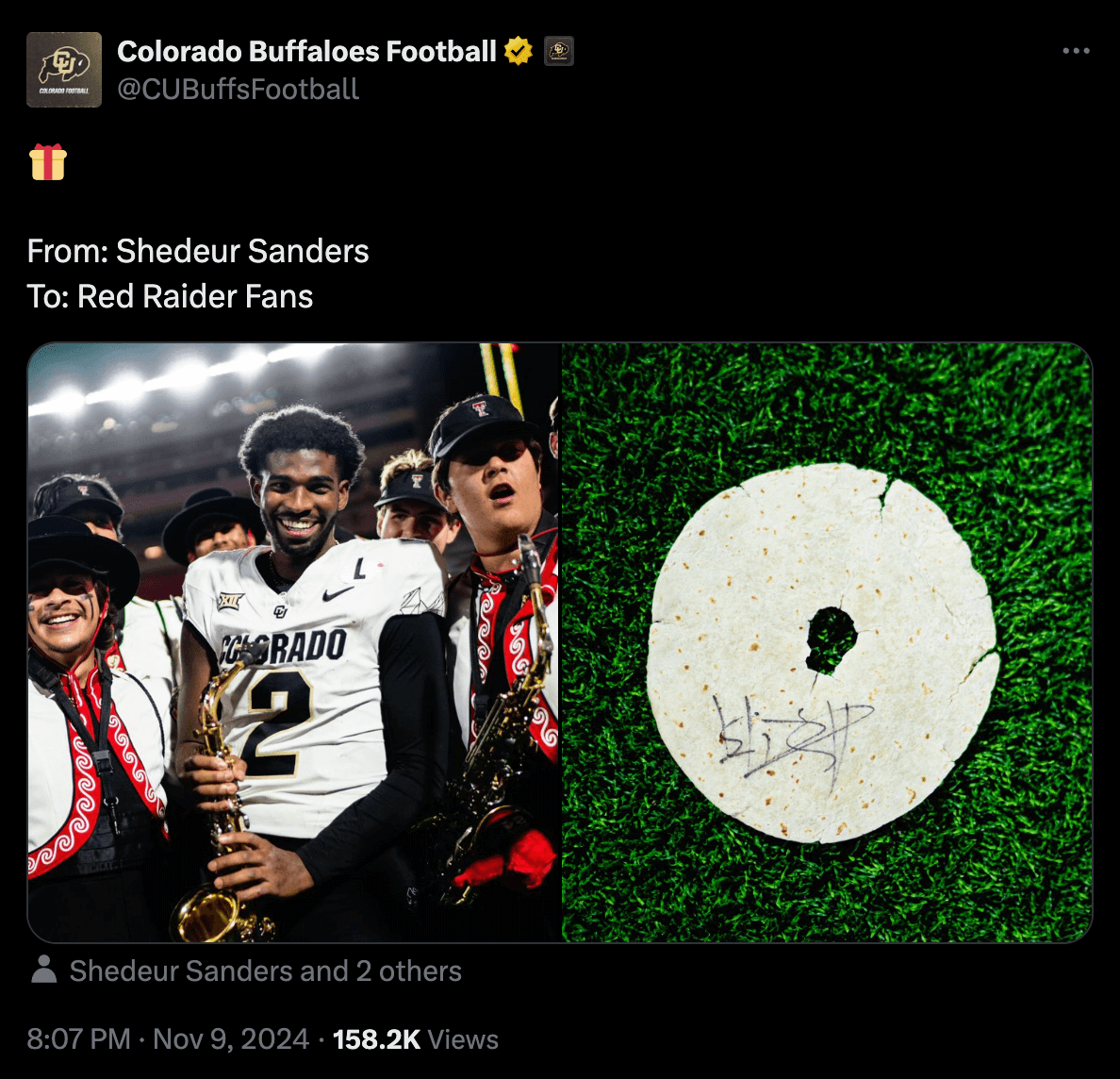 🤯 🤯🤯 من المعروف أن مشجعي تكساس تك يقومون برمي التورتيلا في الملعب عند انطلاق المباراة، ولكن مع وجود كولورادو في المدينة، فقد أضاف التقليد الذي دام عقودًا بعض التوهج إليه. هواة النجم في اتجاهين التقط ترافيس هانتر خبز التورتيلا ووضعه في بنطاله قبل بدء المباراة. وفي وقت لاحق، وقع شيدور ساندرز، كولورادو كيو بي، على تورتيلا، وقال للصحفيين: “لقد استمروا في رميها علي، لذلك اضطررت إلى التوقيع على واحدة”. فاز كولورادو رقم 21 على تكساس تك 41-27 ليحصل على المركز الثاني في Big 12.