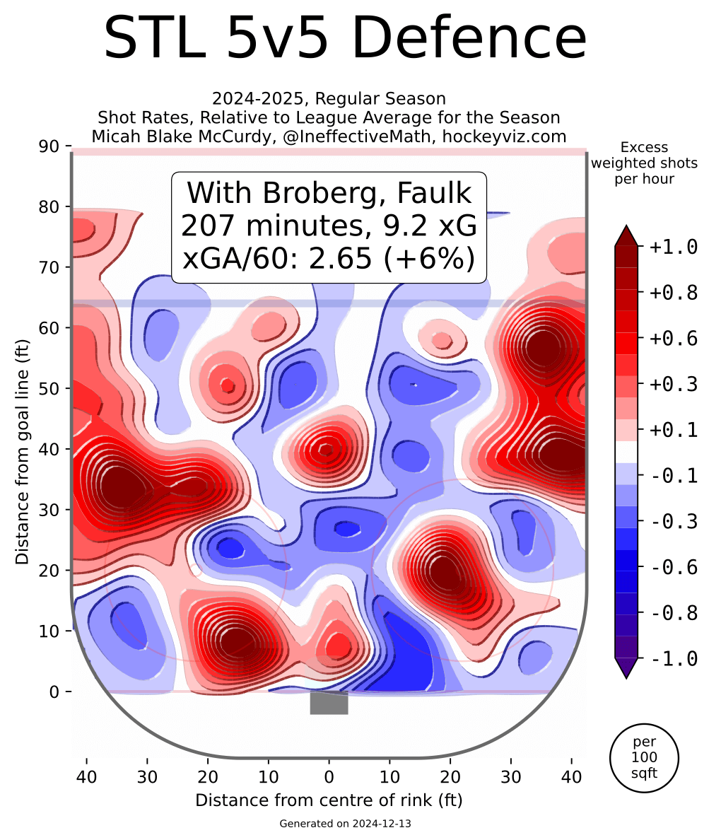دفاعياً، لا يوجد فرق جذري. مع الاثنين معًا، يتخلى البلوز عن 2.65 هدفًا متوقعًا مقابل كل 60 بمعدل خمسة مقابل خمسة. عندما يكون Faulk بدون Broberg، يكون هذا الرقم أقل قليلاً، وعندما يكون Broberg بدون Faulk يكون أعلى قليلاً.