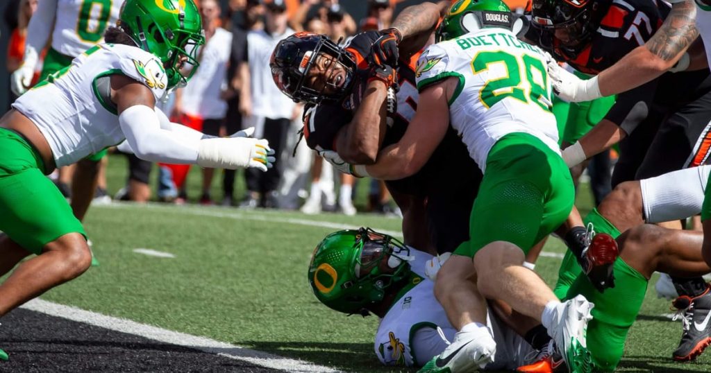 كان التخلف عن الركب في إعادة تنظيم المؤتمر أمرًا واحدًا. فقد أدى فقدان أسطورة البرنامج سميث ورؤية القائمة وهي تُفكك إلى تفاقم المشكلات. تحتل ولاية أوريغون المركز السادس في تصنيف المواهب الجماعية لـ 247Sports، والذي يمثل تصنيفات تجنيد اللاعبين في القائمة الحالية. تحتل ولاية أوريغون المركز 73. كان ذلك واضحًا يوم السبت. حتى مع بقاء فريق بيفرز قريبًا من الفوز في الشوط الأول، لم يركل فريق داكس أبدًا في المباراة. أسفرت المحركات العشر عن ستة هبوطات وهدفين ميدانيين وركلتين ركبة في نهاية الشوط الأول.