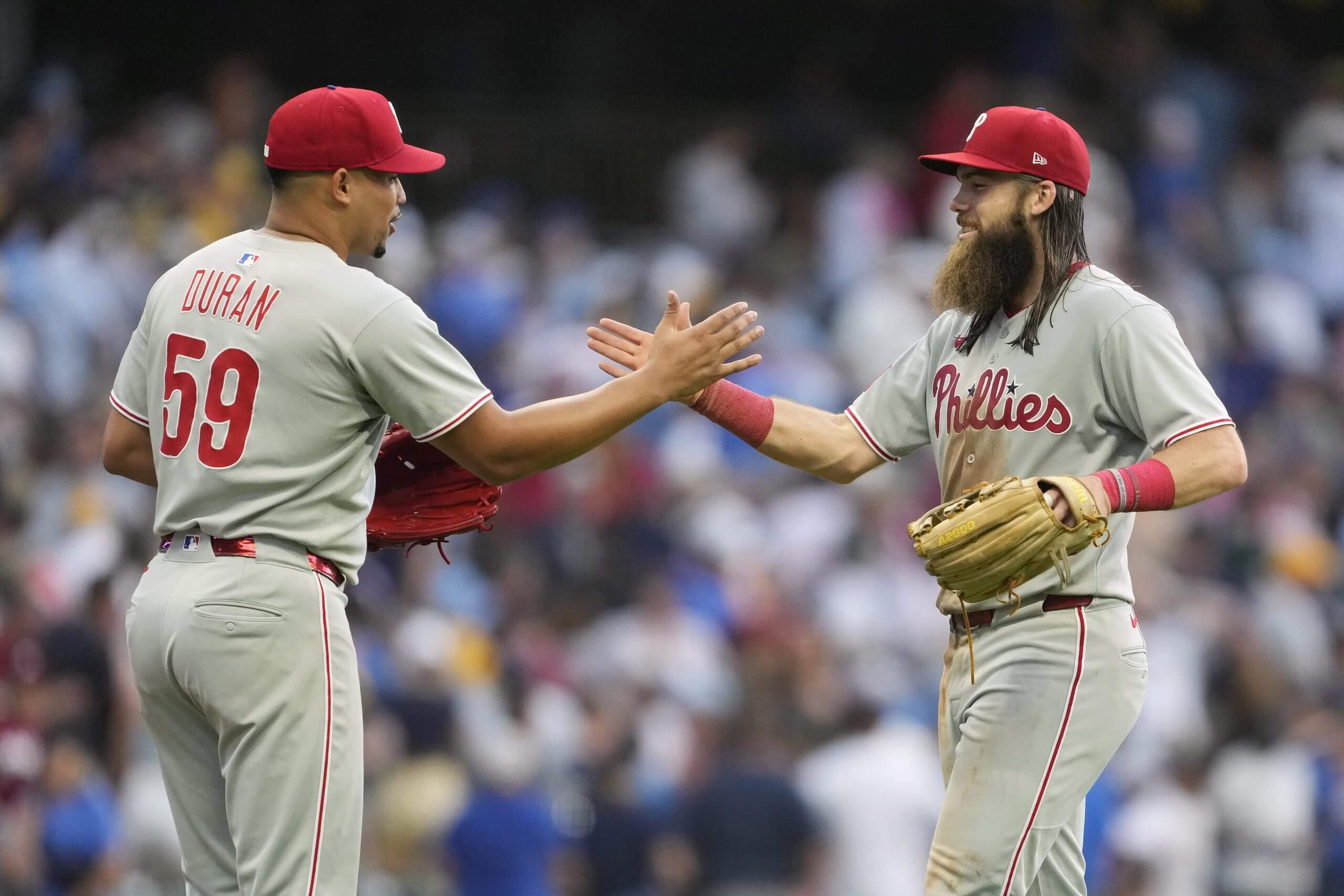 براندون مارش (اليمين ، مع Jhoan Duran) ليس من الصعب إرضاءه بشأن مهمته الخزفية. “أنا أحب ذلك” ، قال عن مكانه ، الذي يقع بجوار زميله في المنزل ، أليك بوهم. (باتريك مكديرموت / غيتي إيمايز)