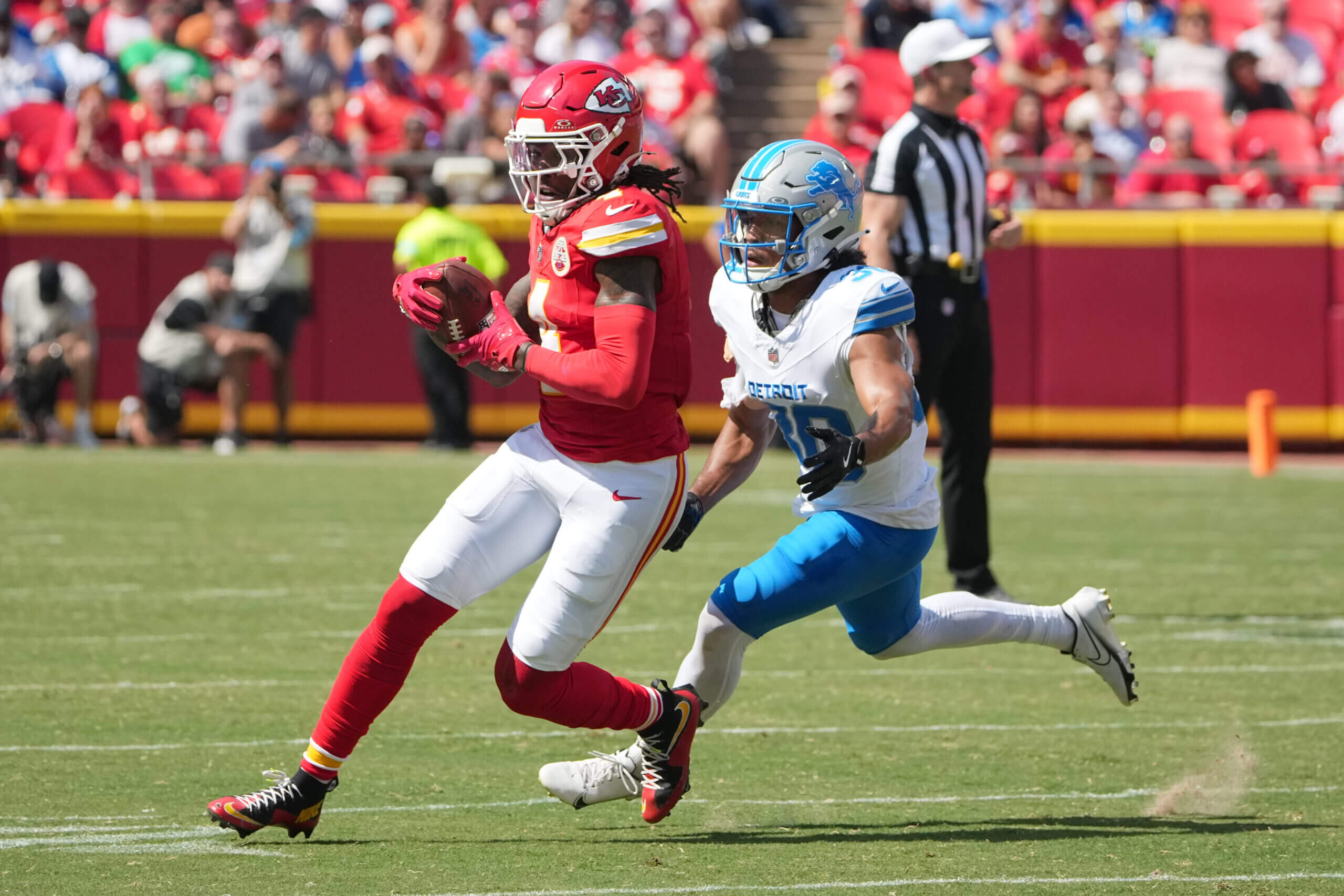 كانت آخر مرة ظهر فيها لاعبو فريق Chiefs الأساسيون على أرض الملعب منذ أكثر من أسبوعين، في المباراة الثانية قبل الموسم ضد فريق Detroit Lions، وهي آخر بروفة قبل أن يفتتح الفريق موسم NFL 2024 مساء الخميس ضد فريق Baltimore Ravens. ضد فريق Lions، كان خيار Mahomes الأساسي في التمرير على الجانب الأيسر من التشكيل، وهو عكس المكان الذي اصطف فيه رايس. عندما لم يعجب Mahomes بما رآه على يساره بعد التقاط الكرة، حول عينيه بسرعة إلى اليمين، إلى رايس، الذي كان في مباراة ضد الظهير خليل دورسي.