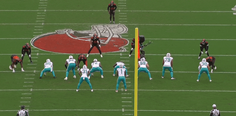 كان فريق Browns في منطقة ثلاثية العمق مع أمان مجاني في منتصف الملعب. عندما سقط تاجوفيلوا، حدق بالفعل في طريق الانجراف للحصول على الأمان المجاني للقفز عليه (انظر الحافة اليمنى لشعار Browns، عند خط 45 ياردة).
