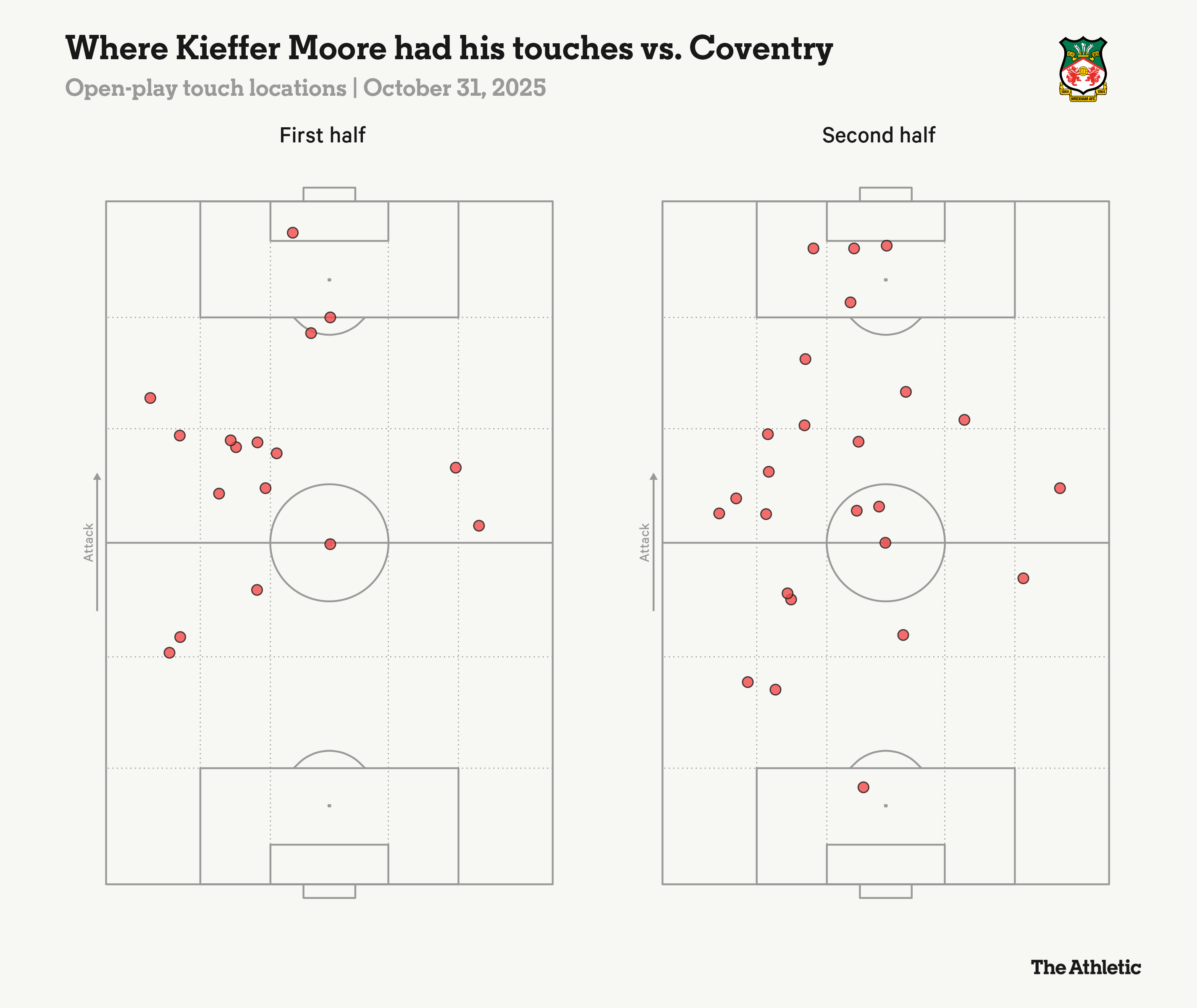 هذه المرة ، فتح ريكسهام كوفنتري على الجانب الآخر ، تمريرة مبهجة من وينداس أخرجت على الفور نصف وسط السيتي لوك وولفيندن من المباراة بينما كان مور يتسابق في الخلف.