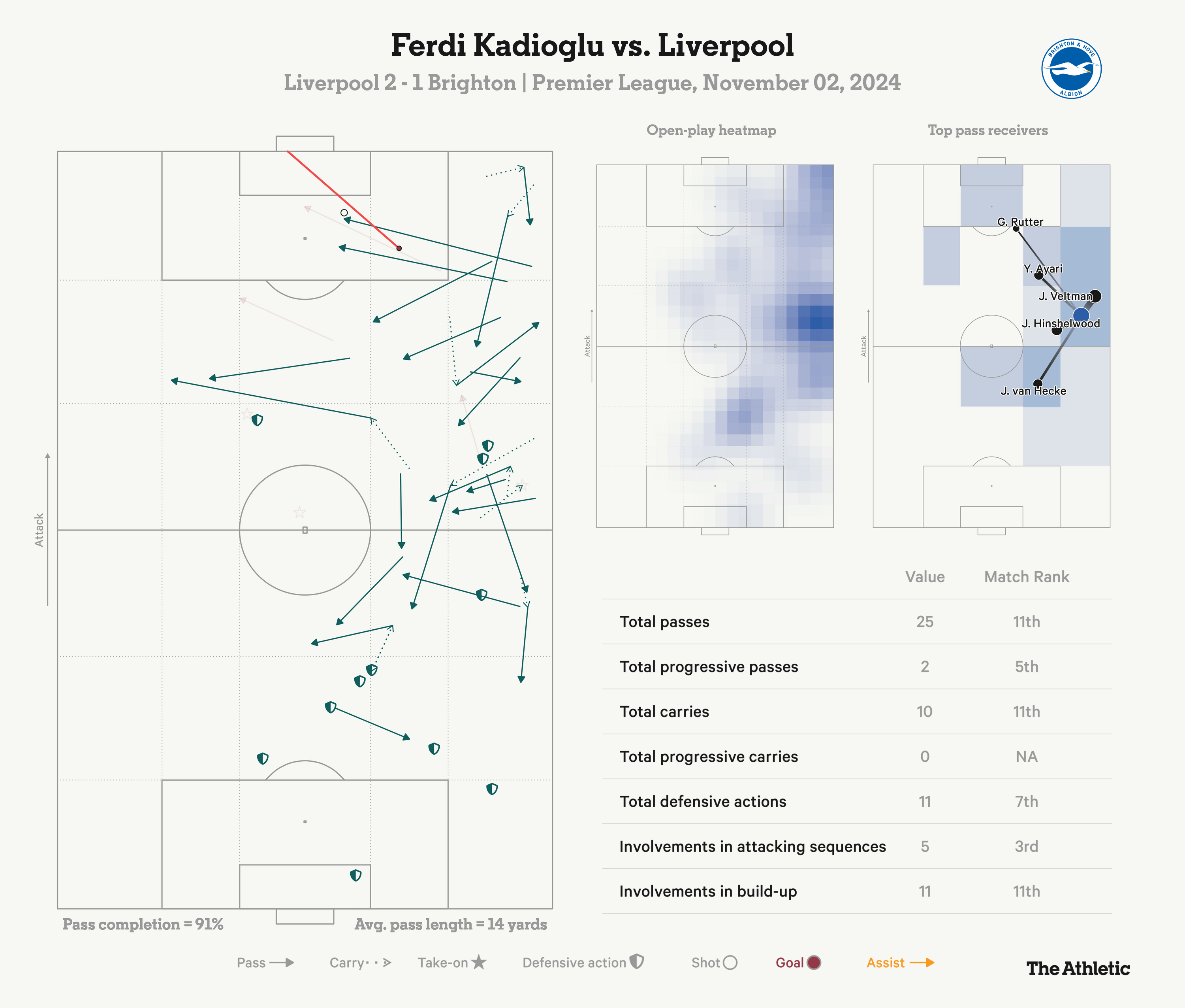 وفي الوقت نفسه، أفلت كاديوغلو من المهمة الشاقة المتمثلة في محاولة التعامل مع صلاح على الجهة المقابلة. قام بيرفيس إستوبينان بذلك بشكل جيد في أغلب الأحيان، حيث أبقى المصري هادئًا حتى قطع صلاح داخل الإكوادوري ليسجل هدف فوز ليفربول.