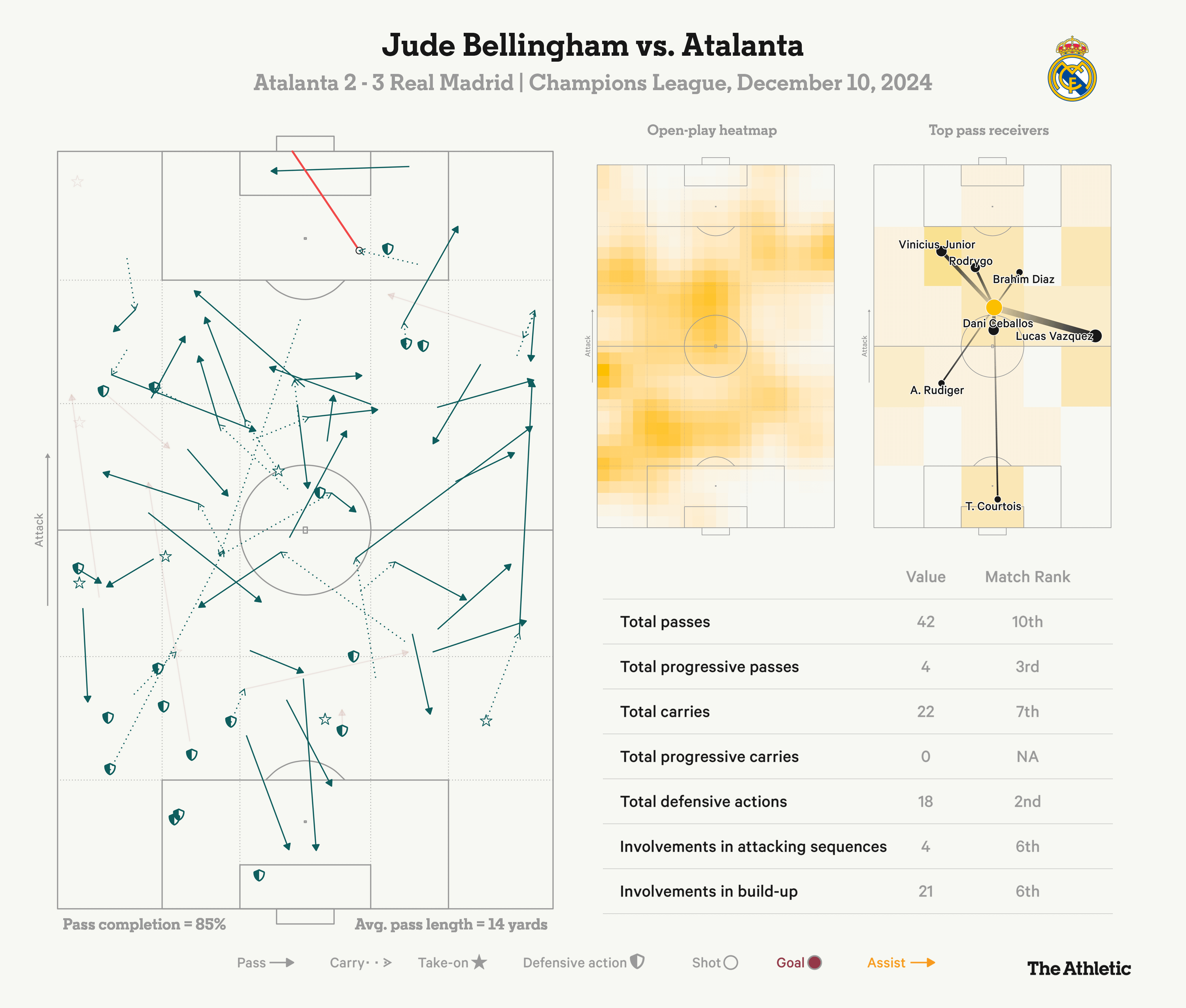 في بيرغامو، قدم الإنجليزي أداءً كاملاً آخر، حيث سجل هدفًا واحدًا، وتمريرتين أساسيتين، وأكمل خمسًا من مراوغاته السبعة، وفاز بتسع ثنائيات وقام بـ 64 لمسة. كان بيلينجهام مرئيًا في جميع أنحاء الملعب وعاد إلى مستوى الموسم الماضي.