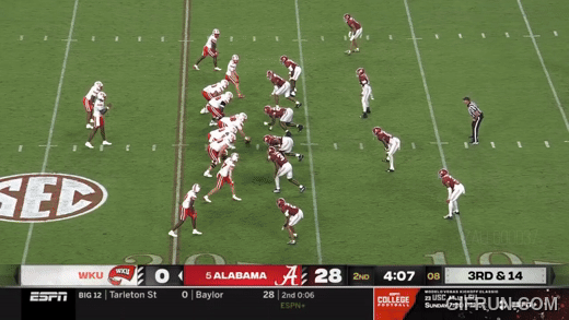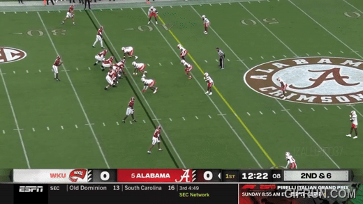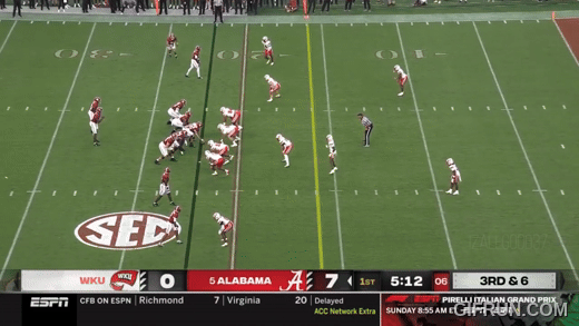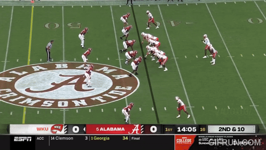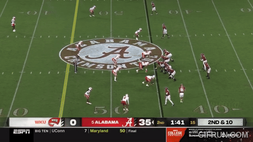 سبقت هذه المسرحية هدف جام ميلر في الربع الثاني. أرسل ويسترن كنتاكي ستة لاعبين في هجوم خاطف، وكان لدى ألاباما ستة لاعبين للحماية، لكن لم يكن التقاطًا نظيفًا وانهار الجيب. لكن ميلرو وجد ثغرة على الجانب الأيمن وهرب لركضة طويلة.