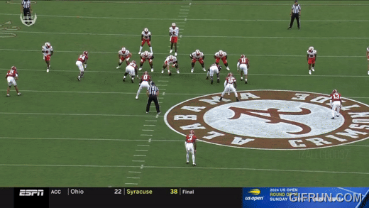 في حين عانت حماية التمريرات في بعض الأحيان، تألقت لعبة الجري. أحد العناصر الأساسية للهجوم الذي يقوده دي بوير هو سحب لاعبي الخط الهجومي. لقد قل وزن خط ألاباما هذا الموسم، وقد ظهر ذلك يوم السبت. لقد أظهر نفسه بعدة طرق، سواء كان ذلك من خلال حارسين (بوكر / روبرتس في أول هبوط اندفاعي لميلرو)، أو برايلسفورد في هبوط ميلر أو من قبل حارس / معالج. تم إنشاء أطول مسرحية في اليوم (هدف جاستيس هاينز البالغ 85 ياردة) من خلال سحب فورمبي وروبرتس.