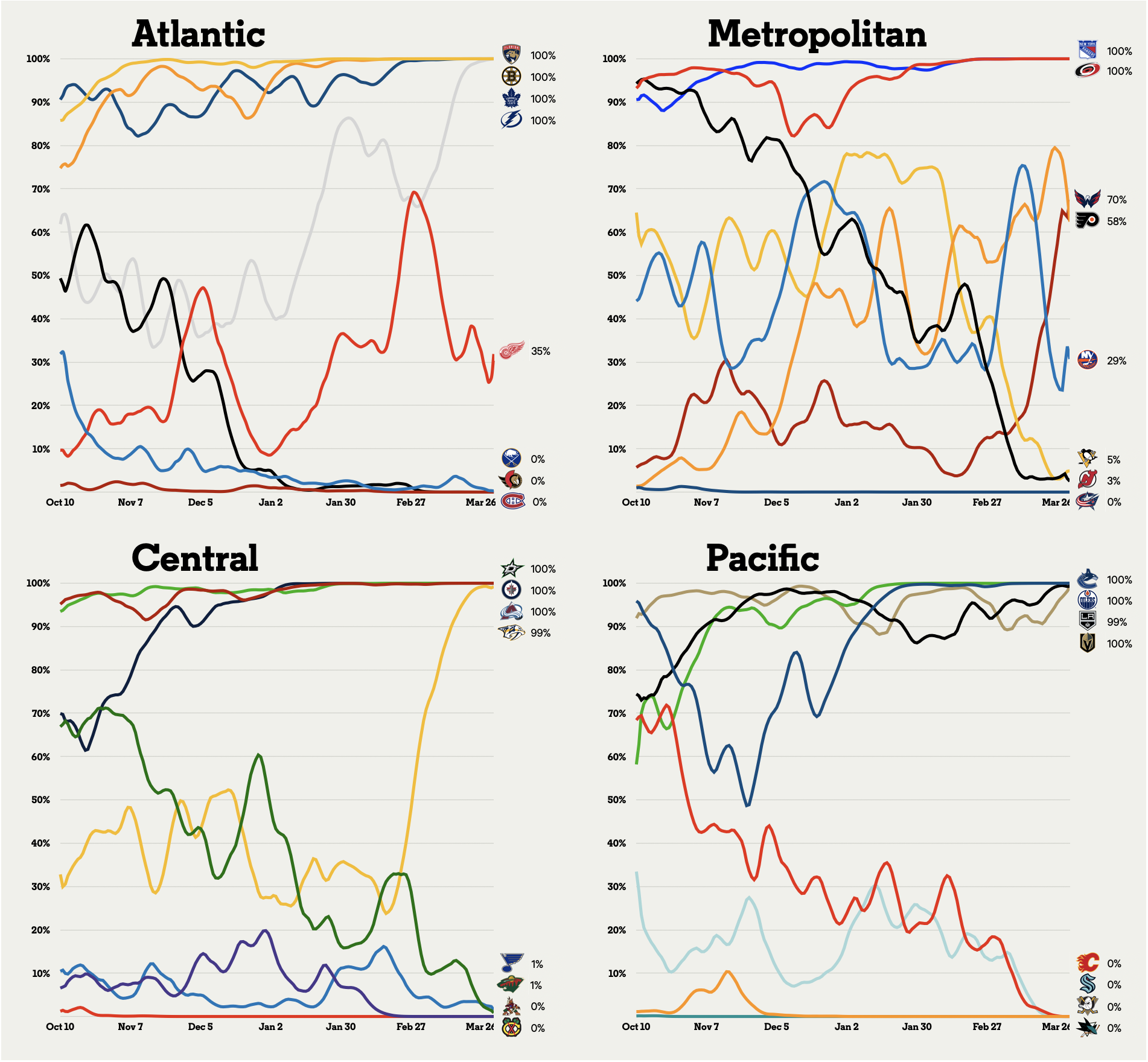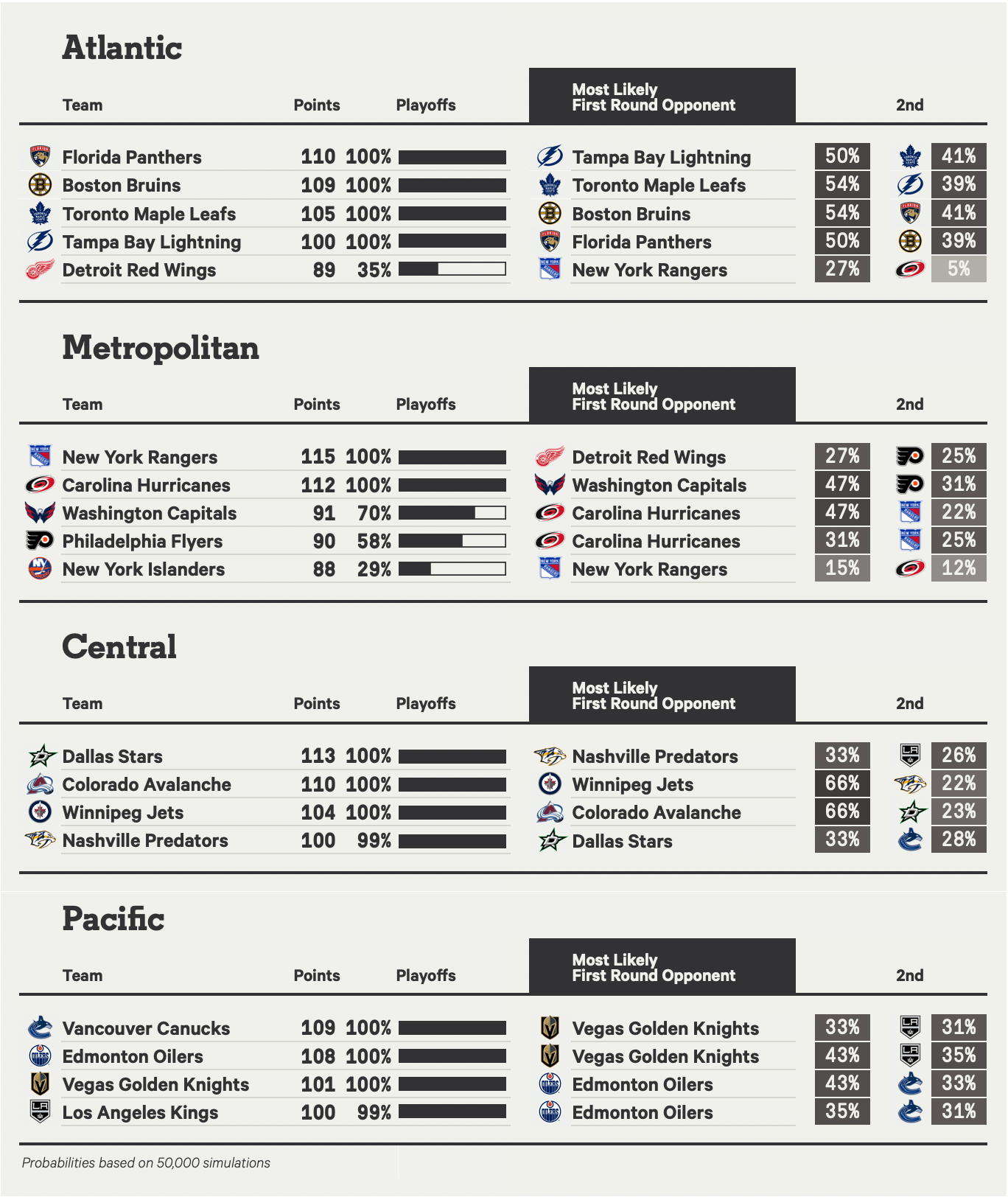 مرحبًا بك في صفحة توقعات واحتمالات دوري الهوكي الوطني (NHL) حيث ستجد إجمالي النقاط المتوقعة لكل فريق، واحتمالية إجراء التصفيات واحتمالات التقدم إلى كل جولة لاحقة، بما في ذلك الفوز بكأس ستانلي.