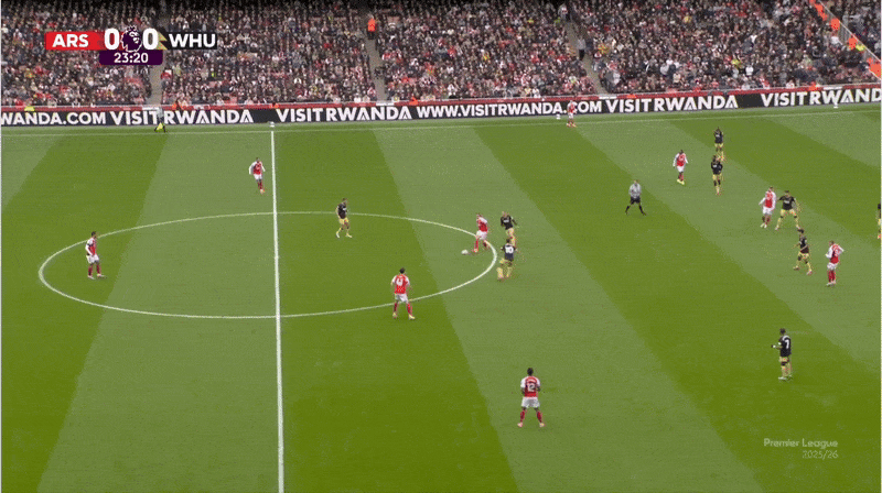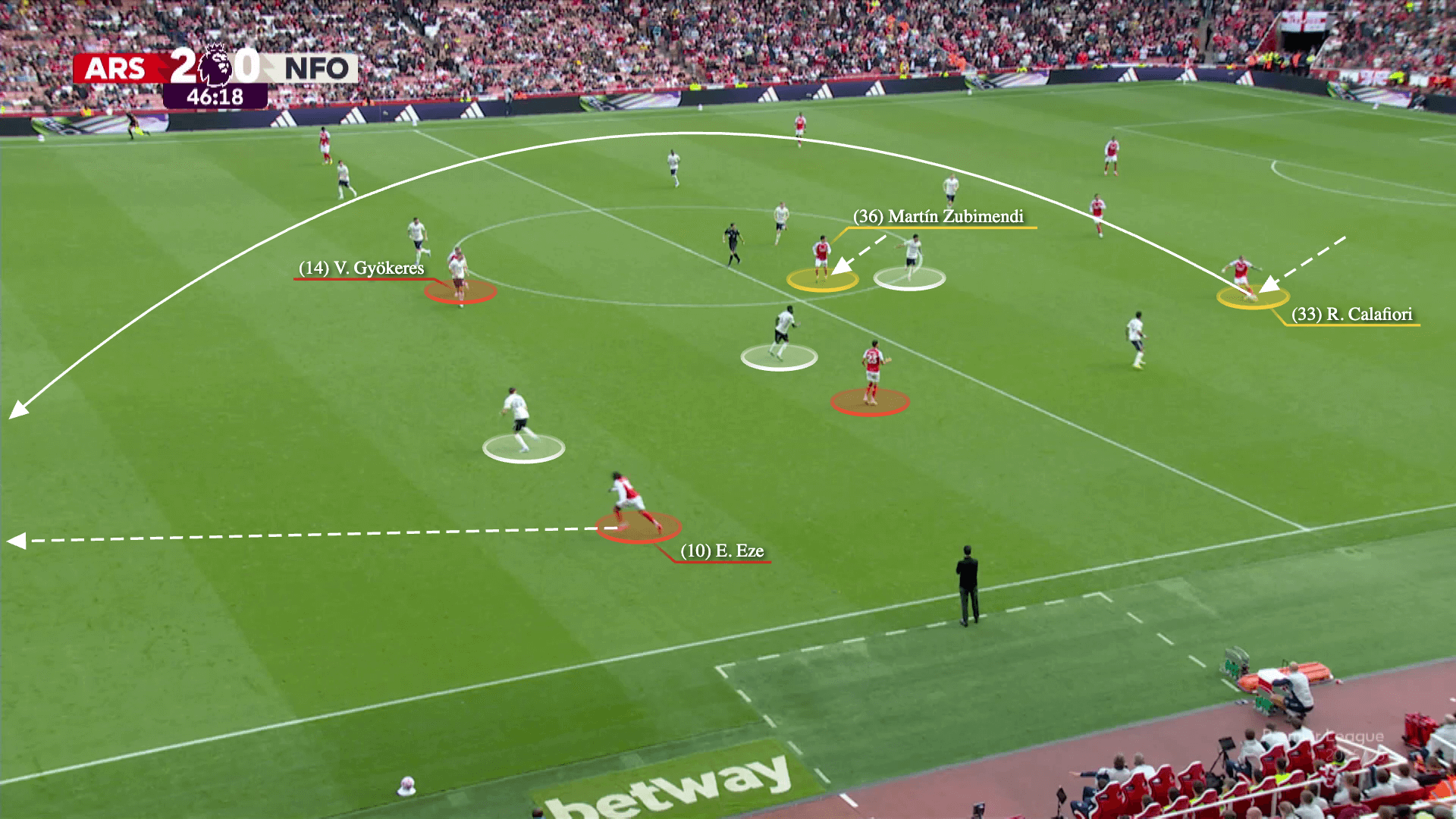 وهنا الهولندي في موقع متقدم حيث يعيد ساكا الهجوم. في البداية، يراقب فرنانديز تيمبر، لكن تمركز إيز يجبره على التقدم في الملعب، ومع وجود الحاج مالك ضيوف يراقب ساكا، فإن الظهير الأيمن لأرسنال حر في نصف المساحة الأيمن.
