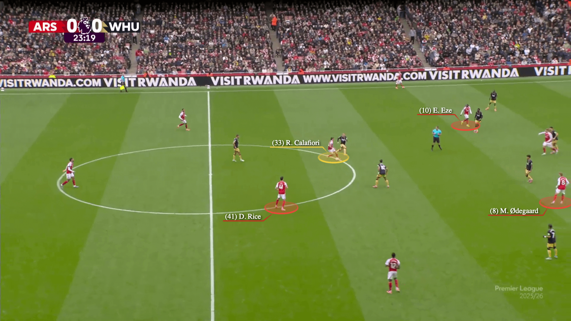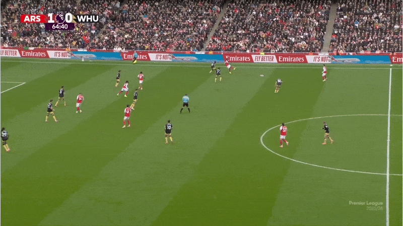 يعد تشغيل رايس فعالاً في هذا الهجوم لأنه يمنع جيمس من التقدم للضغط على كالافيوري، ويسحب رودون بعيدًا عن فيكتور جيوكيريس، مما يضع مهاجم أرسنال في موقف واحد مقابل واحد.