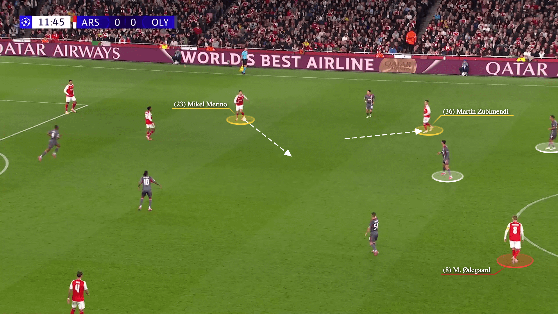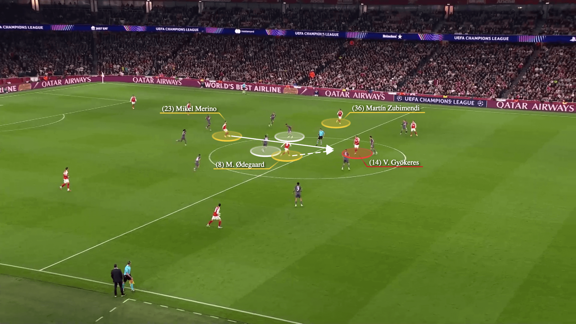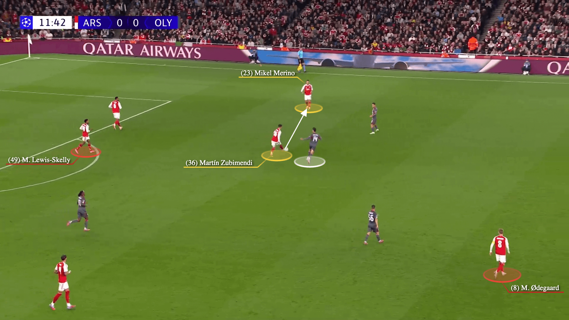 وهنا يبدأ أرسنال هجومه سريعا، مع انتقال ميكيل ميرينو إلى مساحة الظهير الأيسر. زوبيميندي يمرر الكرة لميرينو…