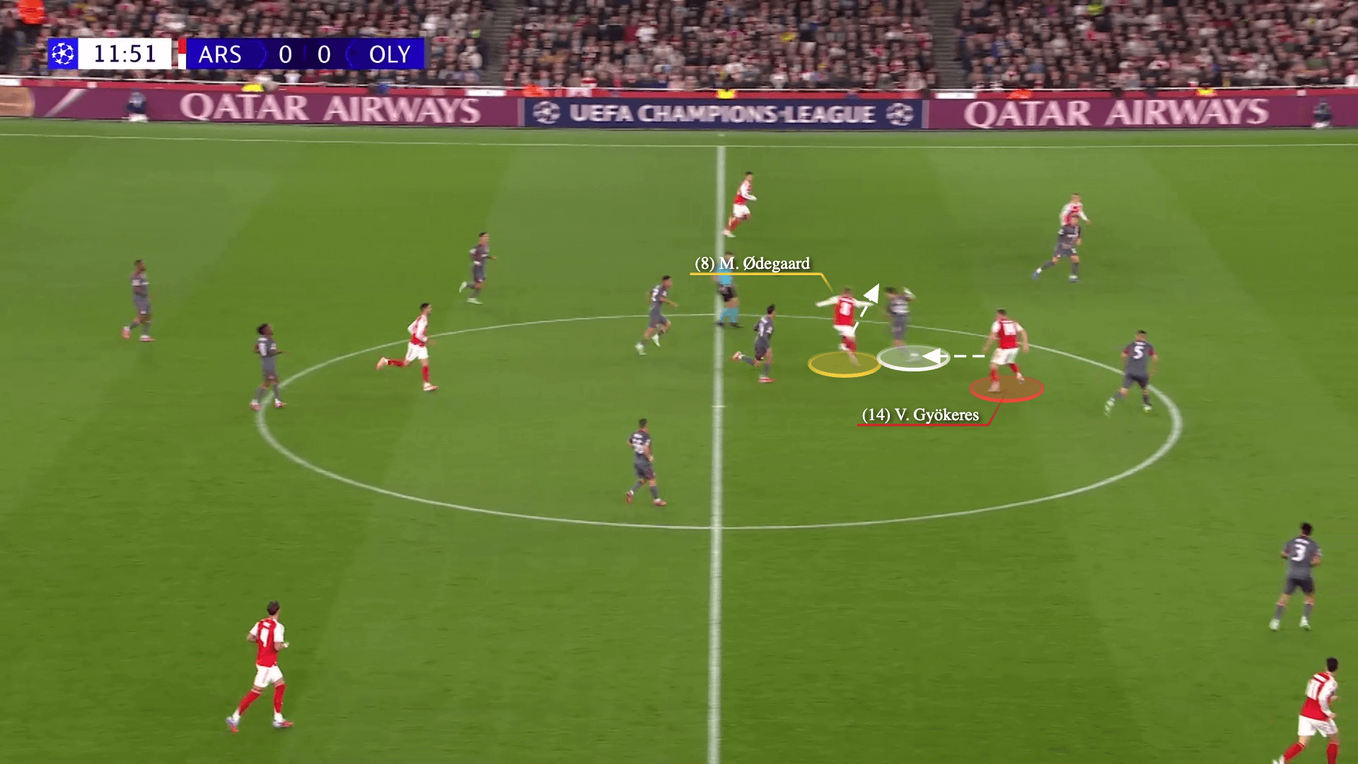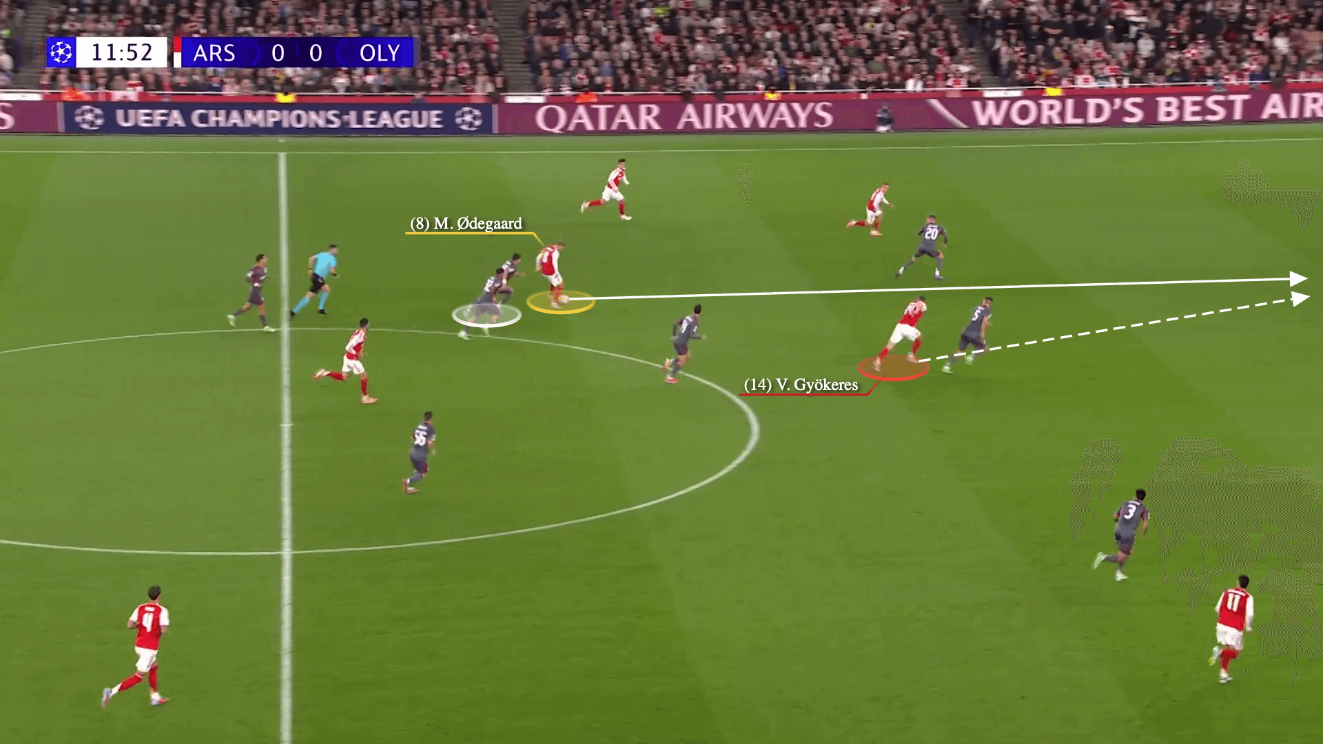 … والأهم من ذلك، بسبب التهديد الذي يشكله ثلاثي هجوم أرسنال. إذا قام جارسيا أو هيزي بالضغط على ميرينو، فسيحتاج أحد لاعبي قلب دفاع أولمبياكوس إلى القفز للأمام، تاركًا بقية دفاعهم في موقف ثلاثة مقابل ثلاثة – وهو السيناريو الأمثل لجوكيريس.
