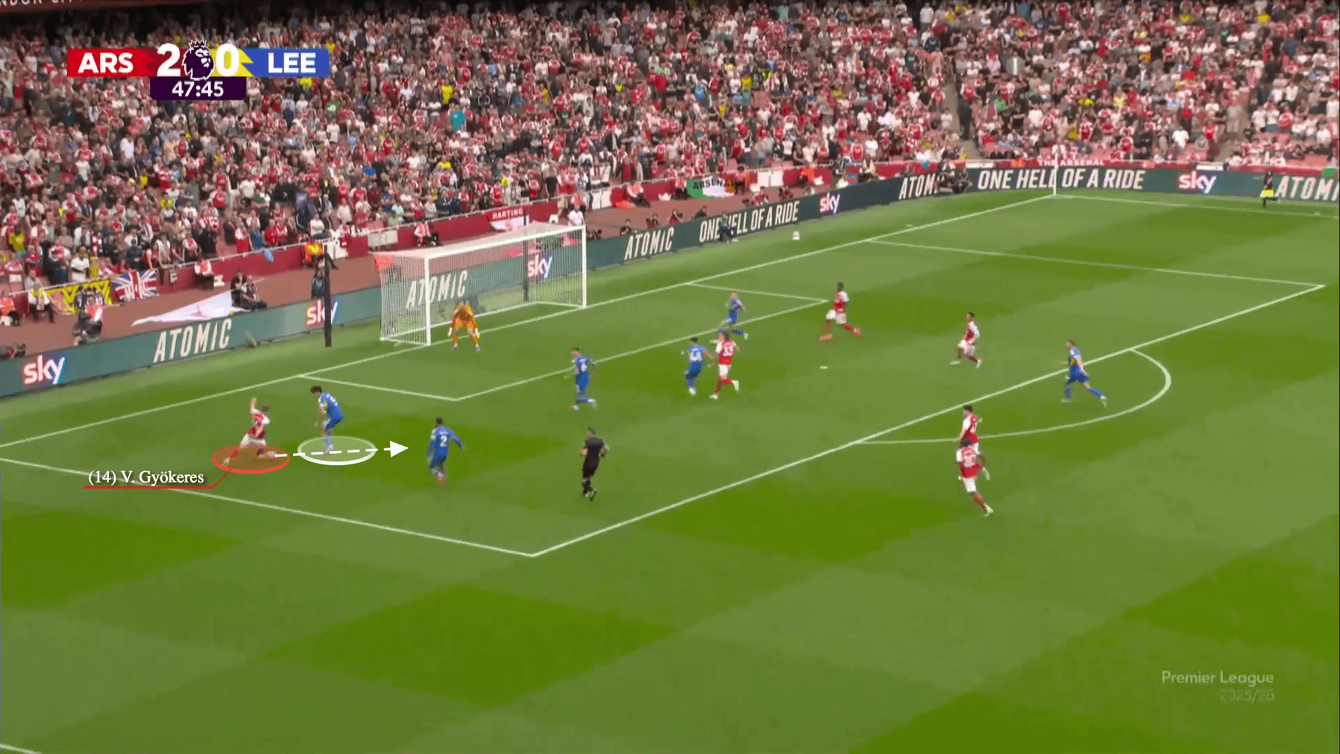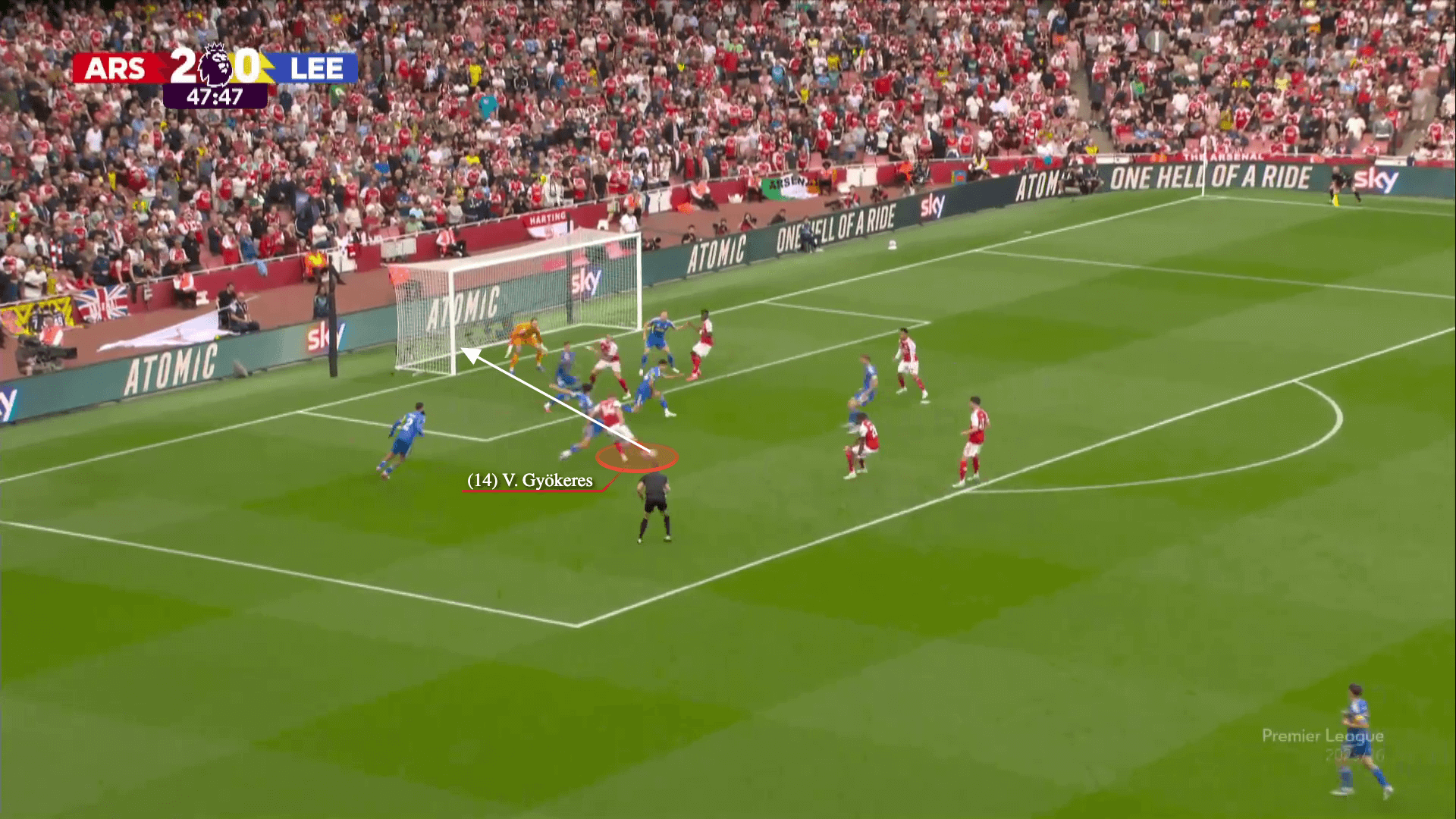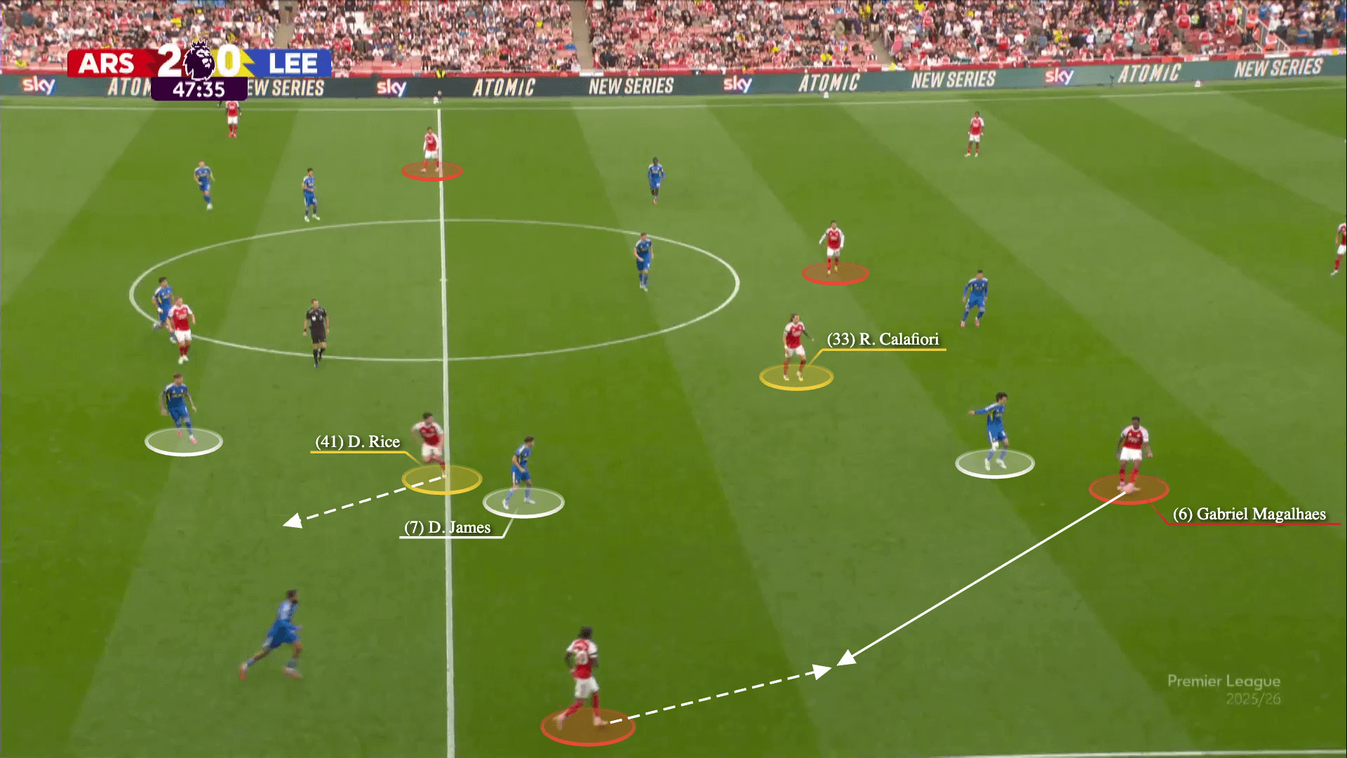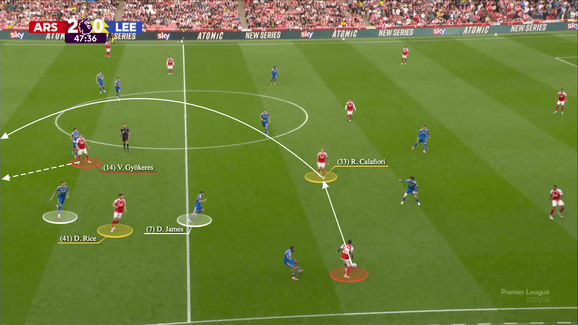 بينما يقوم آو تاناكا بسد ممر التمرير لكالافيوري، يمرر غابرييل الكرة بعيدًا إلى نوني مادويكي. في الوقت نفسه، يهاجم رايس المساحة بين ظهير ليدز الأيمن وقلب الدفاع الأيمن…