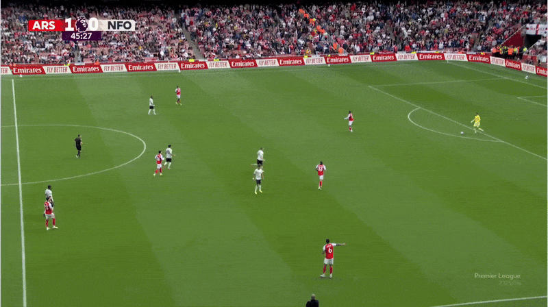هذا التلاعب بفرنانديز وكيلمان يسمح لرايس بالعثور على ركض بوكايو ساكا خلف الدفاع من خلال لعب كرة مباشرة داخل القناة. ساكا “يسجل” من هذه الحركة، لكنه كان متسللاً بفارق ياردة.