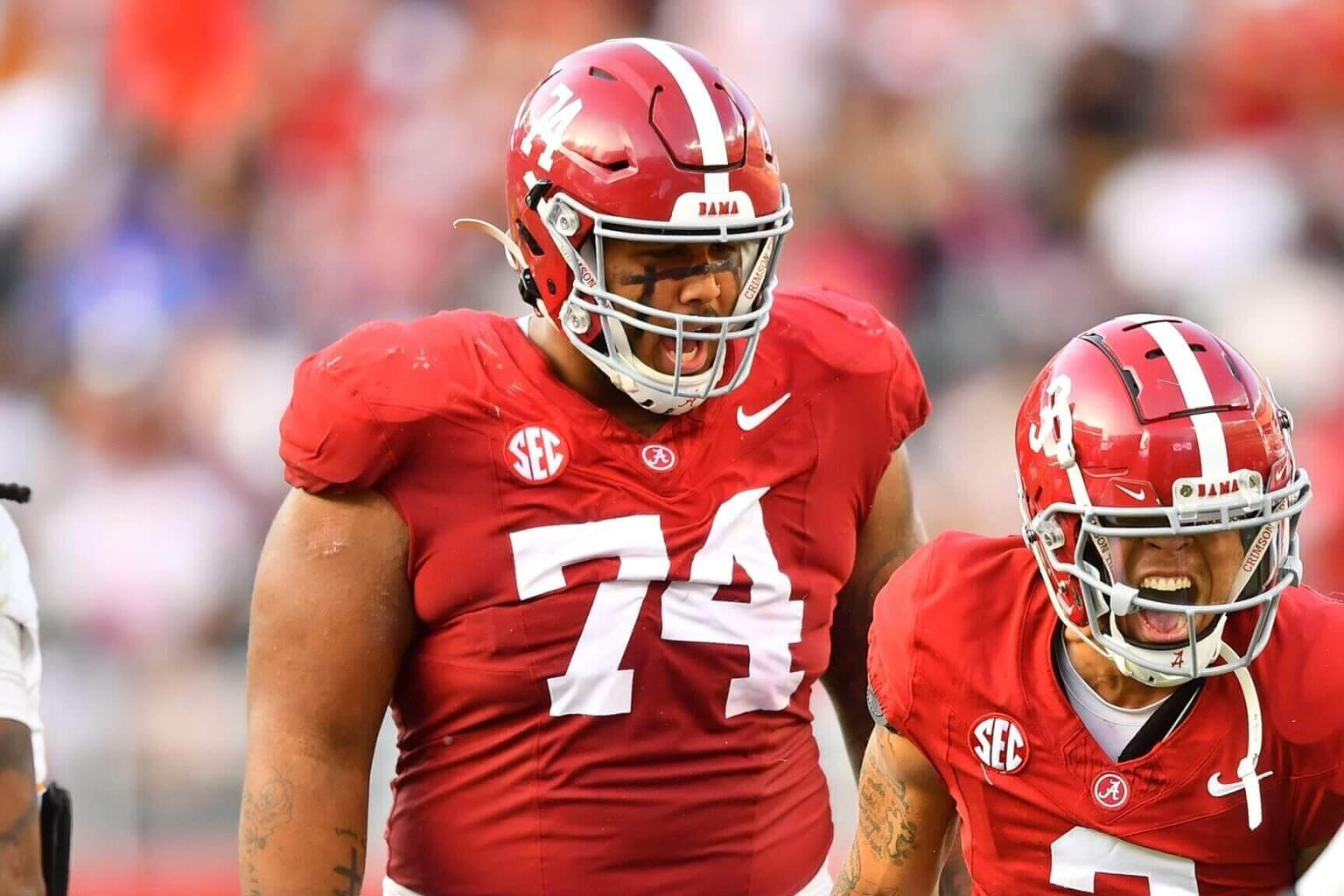 خط الهجوم الأساسي لفريق ألاباما (من اليسار إلى اليمين) يتكون من إيليجاه بريتشيت، تايلر بوكر، باركر برايلسفورد، جيدن روبرتس، وويلكين فورمبي.