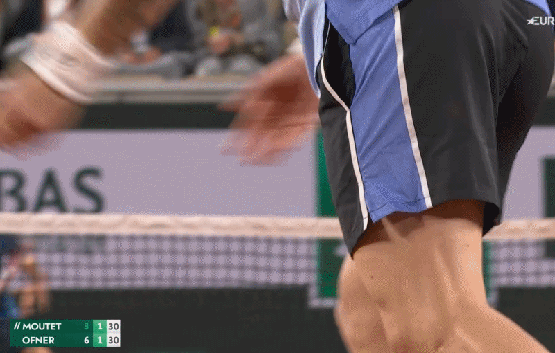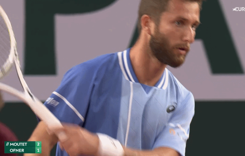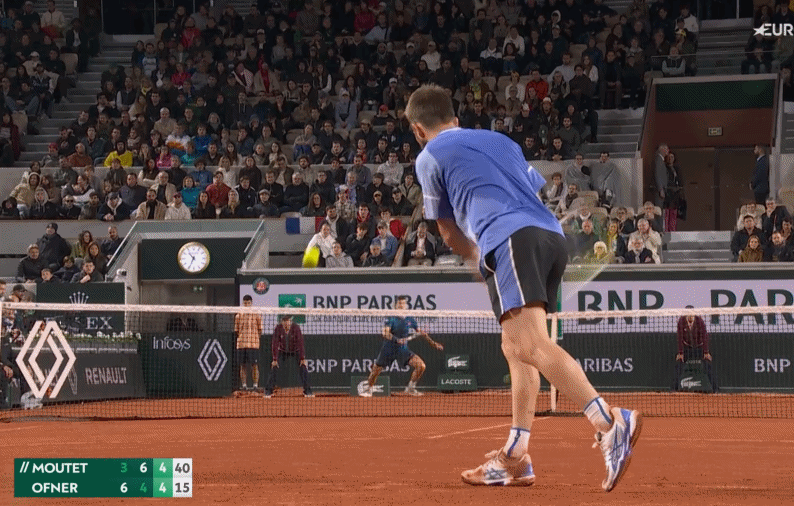ضغط أقل قليلاً عند 30-30، ولكن لا يزال مكانًا ضيقًا جدًا للتسديد – وخسارة موتيه الأولى بنقطة خلفه. هذا كله يتعلق بحركة أوفنر، بقدر ما تكون الكرة ليست واسعة بما يكفي داخل منطقة الجزاء. لقد قطع خطوة كبيرة في الملعب، مما مكنه من تثبيت قدميه والتحرك خلال الضربة الأمامية بمزيد من التحكم مقارنة بالمثال السابق الذي أخطأه لفترة طويلة، حيث اجتاحها في الملعب المفتوح.