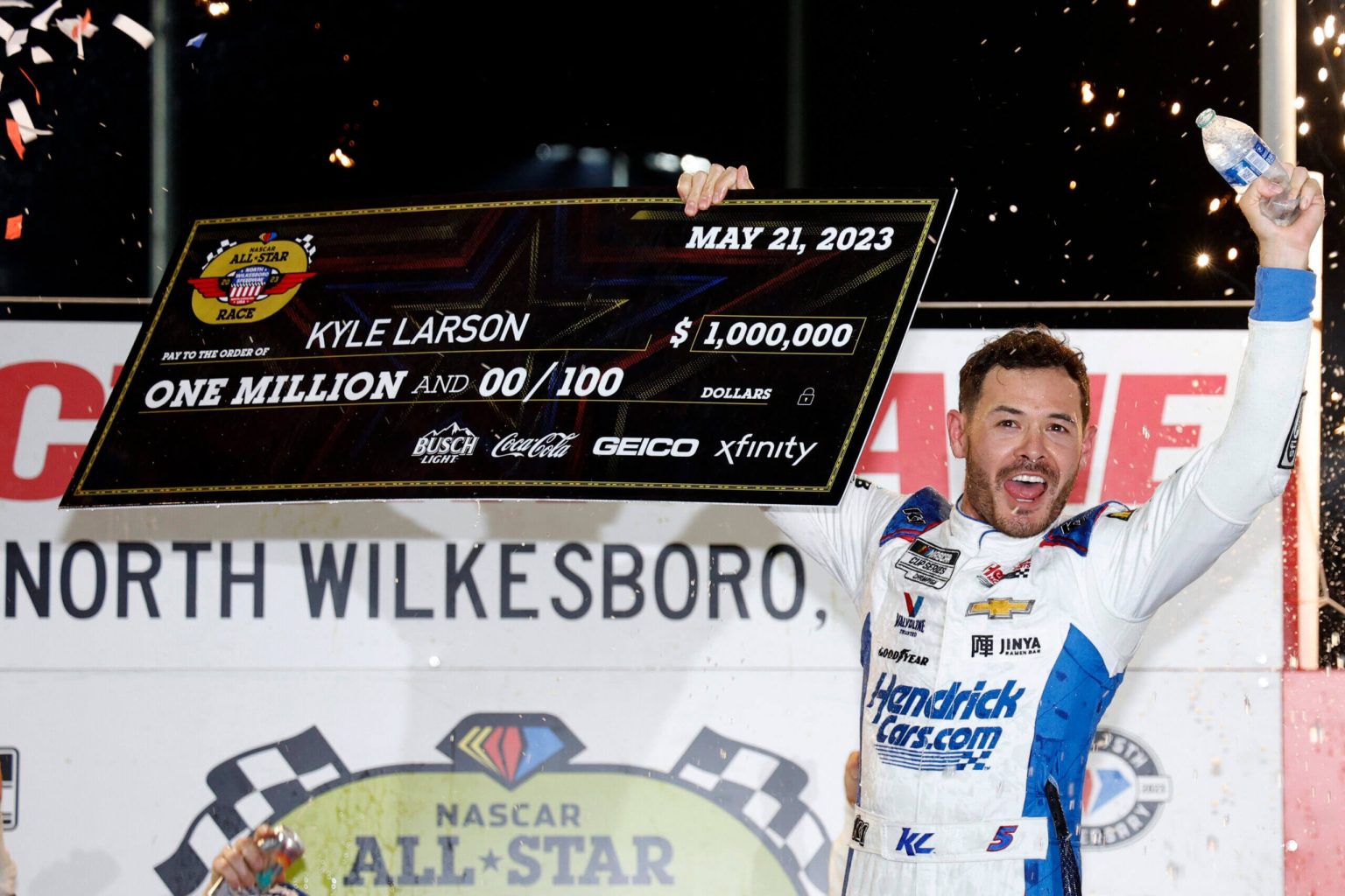 (صورة كايل لارسون يحتفل بفوزه بمليون دولار في سباق كل النجوم العام الماضي: كريس جرايثن / غيتي إيماجز)