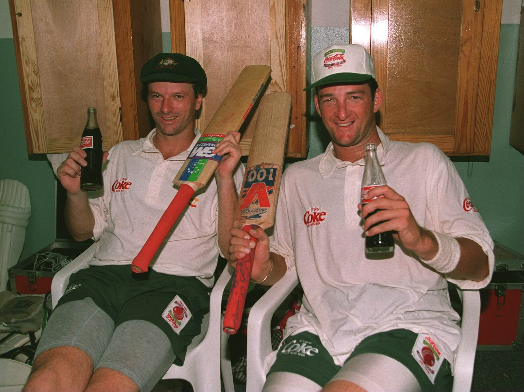 مارك وو وشقيقه التوأم، ستيف، بعد أن لعبا قرونًا مع أستراليا ضد جزر الهند الغربية في عام 1995 (Shaun Botterill/Allsport)