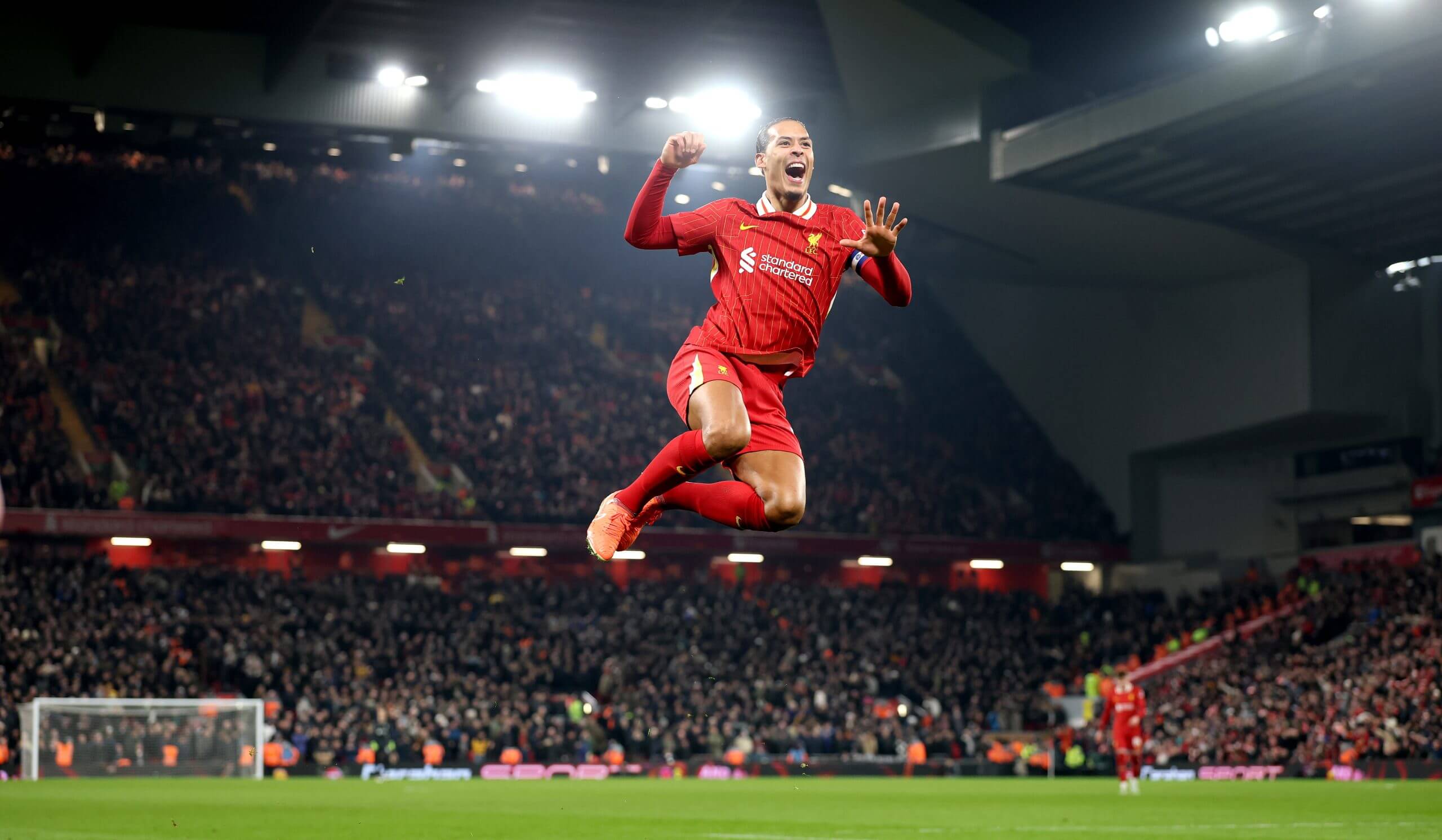 يحتفل Virgil Van Dijk بالتسجيل ضد سبيرز (Carl Recine/Getty Images)