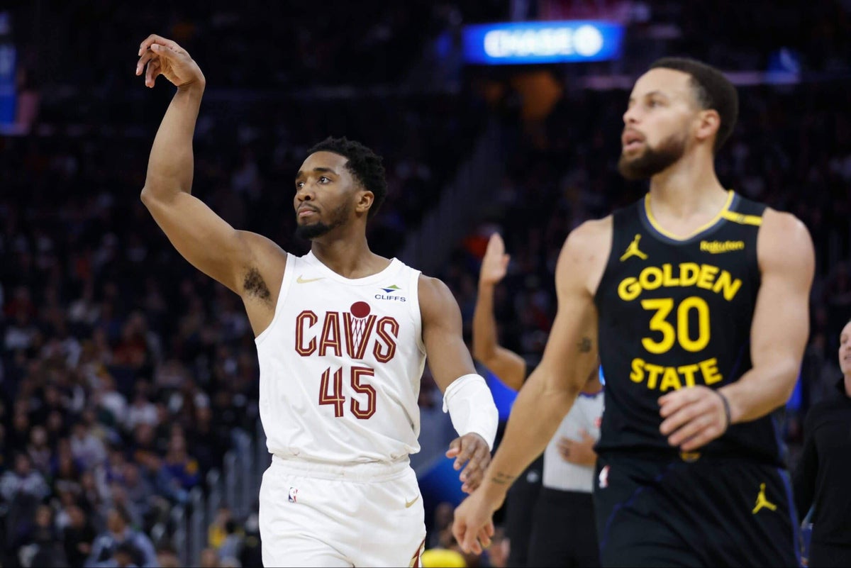 (الصورة العليا لدونوفان ميتشل وستيف كاري يشاهدان تسديدة ميتشل الناجحة المكونة من ثلاث نقاط: لاتشلان كننغهام / غيتي إيماجز)