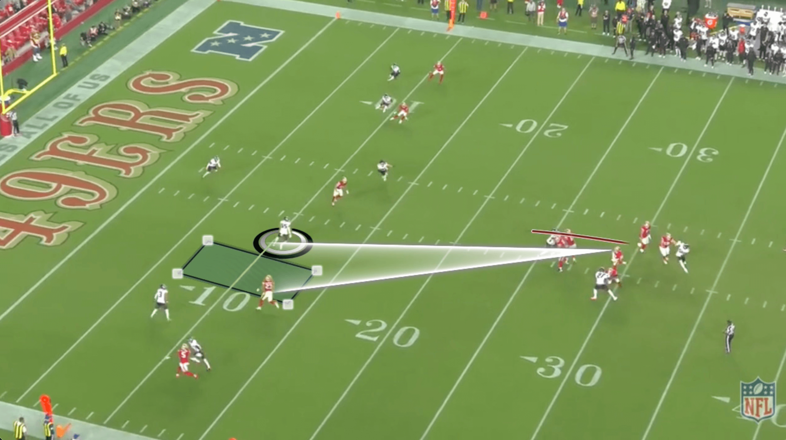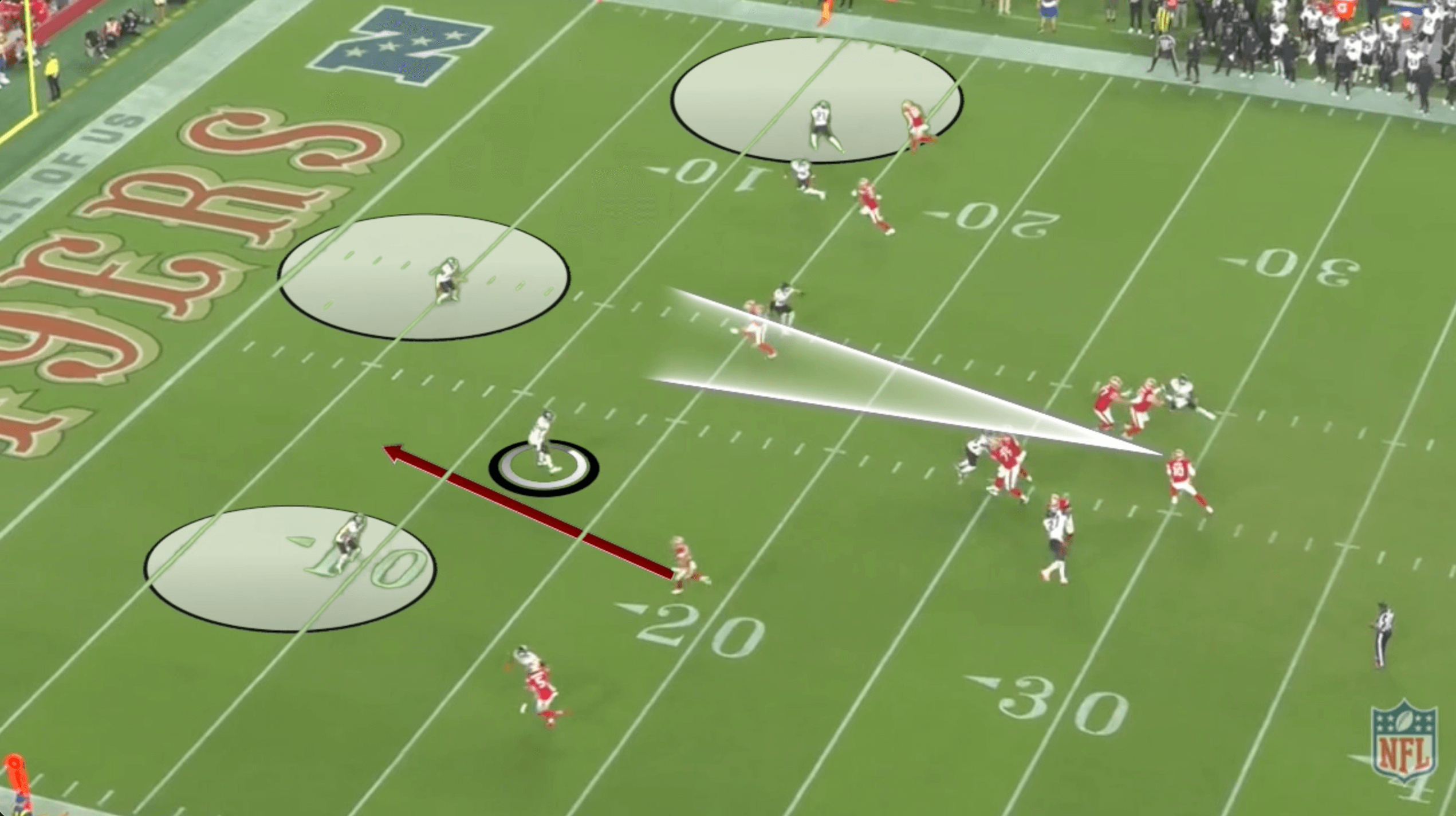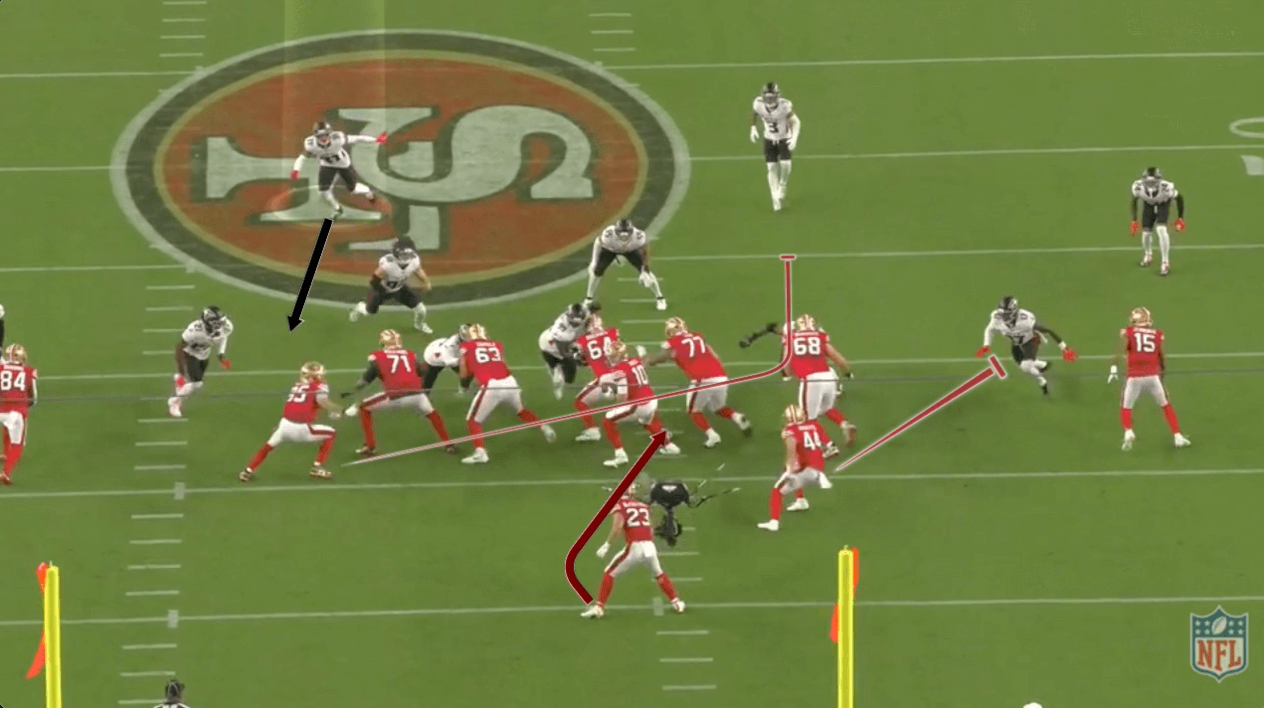 هنا ، بدأ فريق 49 بتشكيل متوازن حيث اصطف كيتل في الجهة اليسرى والظهير كايل جوستشيك على اليمين. قبل اللقطة، بدأ Juszczyk في التحرك نحو اليسار. عادةً، عندما يتحرك Juszczyk بهذه الطريقة، سيركض اللاعبون الـ 49 خارج المنطقة إلى جانب Kittle، مع مضاعفة Kittle وJuszczyk للاعب الحافة.