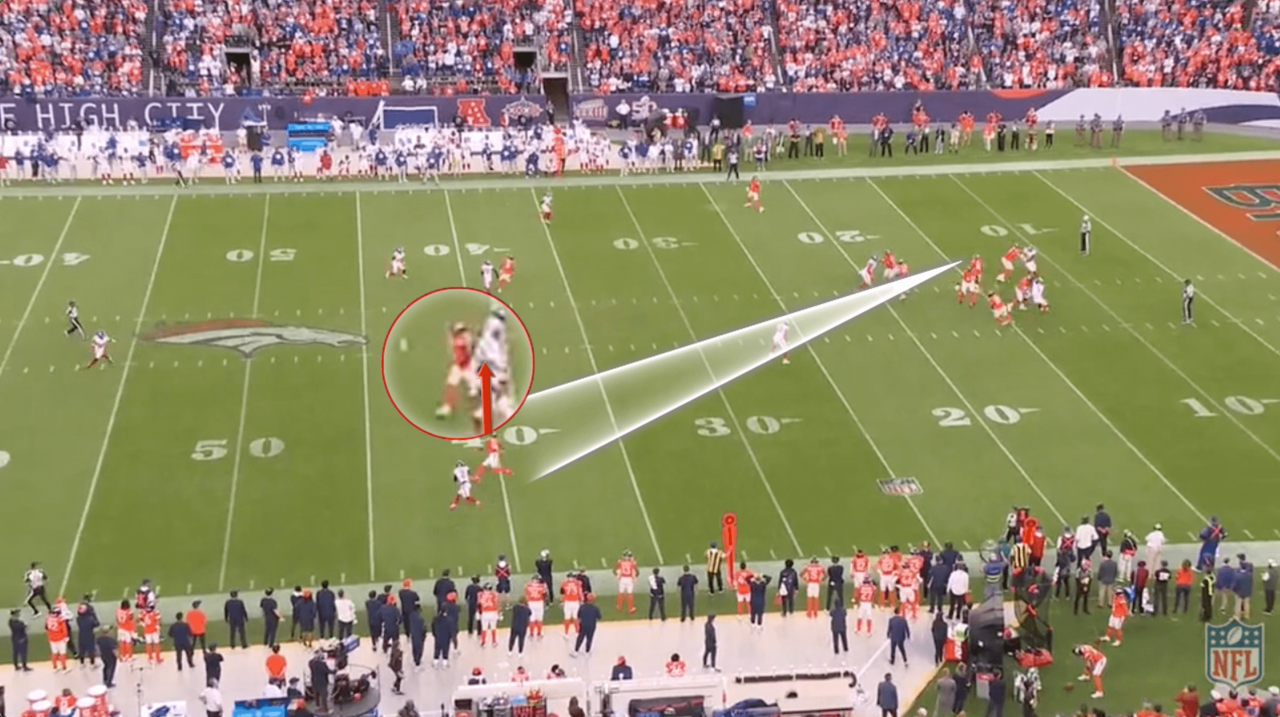 كرد فعل على الحركة، استدارت وحدة الصقور الآمنة نحو اليسار، على افتراض أن Juszczyk سيقطع الطريق بالكامل عبر التشكيل. ومع ذلك، عندما تم قطع الكرة، علق Juszczyk قدمه في الأرض واتجه إلى اليمين لصد المدافع الحافة من هذا الجانب، بينما انسحب كيتل عبر التشكيل ليقود إلى الحفرة لمكافري.