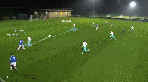 في مباريات إيفرتون تحت 21 عامًا ضد ساوثهامبتون في ديسمبر 2023 (أدناه)، يقطع دوبين إلى الداخل، مستغلًا الفجوة بين سوني ديفيس وجوشوا ليت، الذي لم يتمكن من الدوران بسرعة كافية لمطابقة تسارع دوبين. ثم يستغل Dobbin المساحة للتسديد والتسجيل.