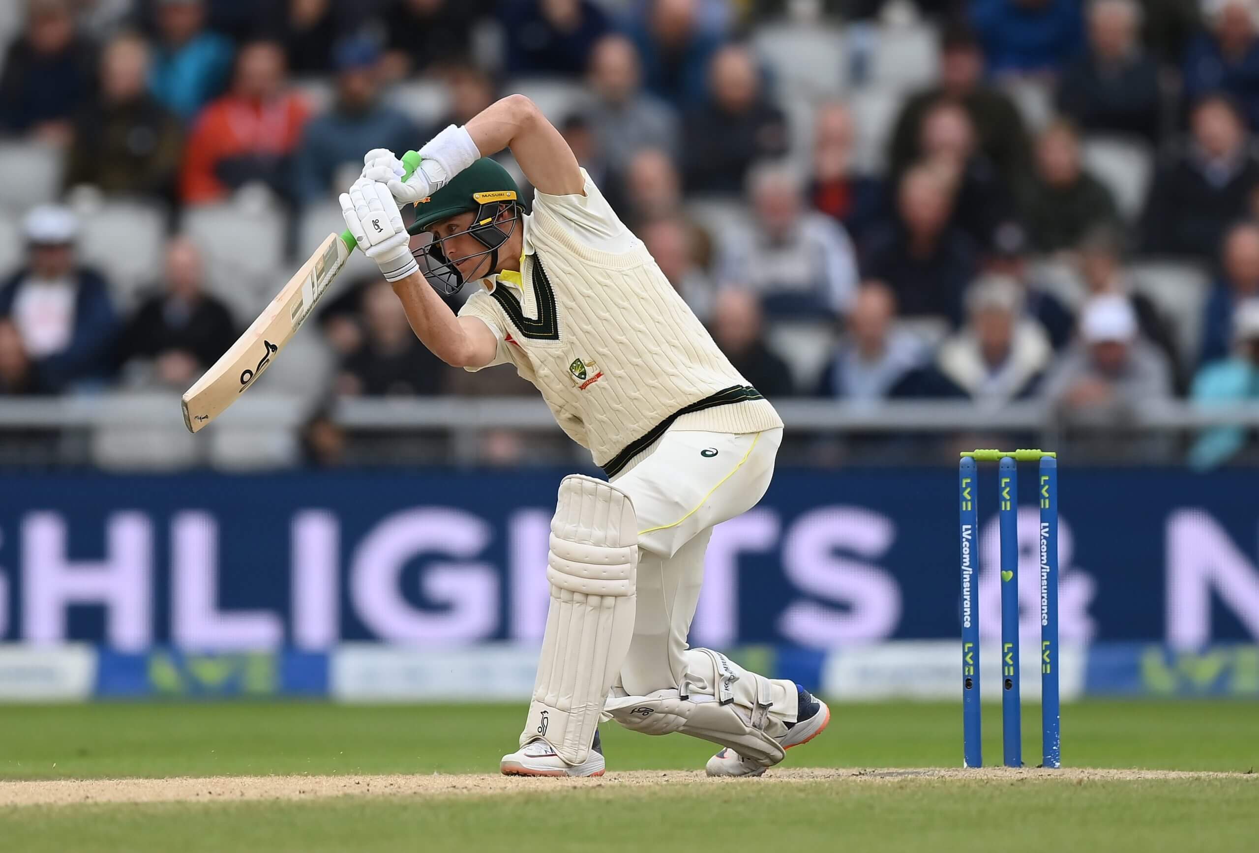 Marnus Labuschagne يكشف عن إحدى محركات غلاف علامته التجارية في أولد ترافورد في عام 2023 (أليكس ديفيدسون / غيتي إيماجز)