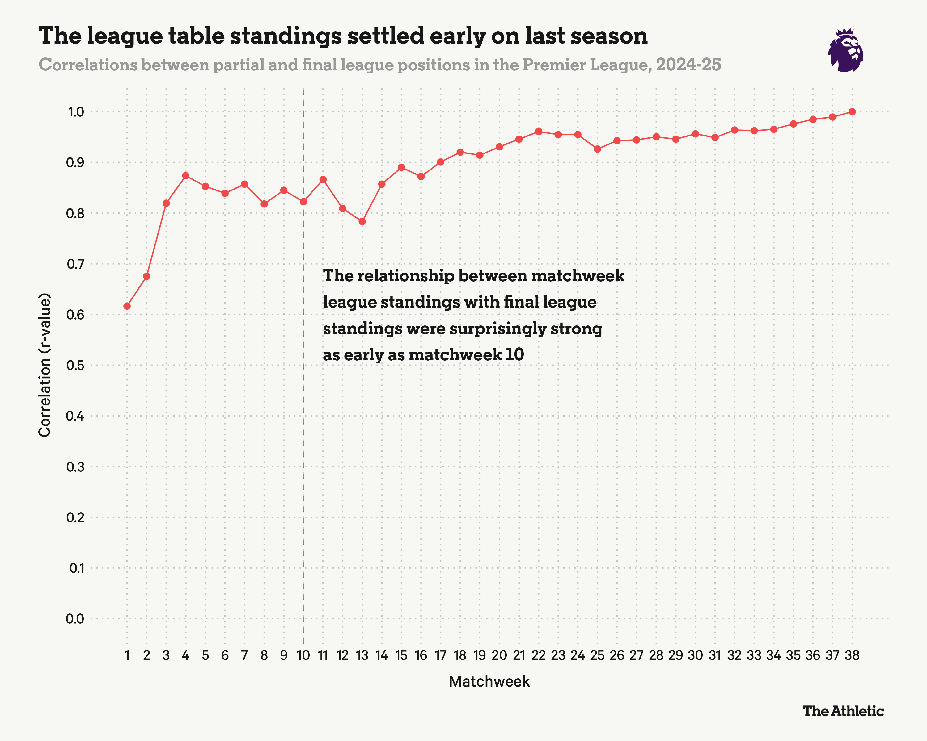 سلطت نظرة فاحصة على النتائج التي توصلت إليها دراسة عام 2019 الضوء على مدى استقرار جدول الدوري الأوسع في هذه المرحلة من الحملة. في الدوري الإنجليزي الممتاز، وجد الباحثون أن 77 في المائة من التباين الإحصائي في الترتيب النهائي للدوري تم تفسيره من خلال الأسبوع العاشر. وبحلول الأسبوع العشرين، ارتفعت هذه النسبة إلى 87 في المائة. وبعد الجولة 30، بلغت النسبة 94 في المائة.