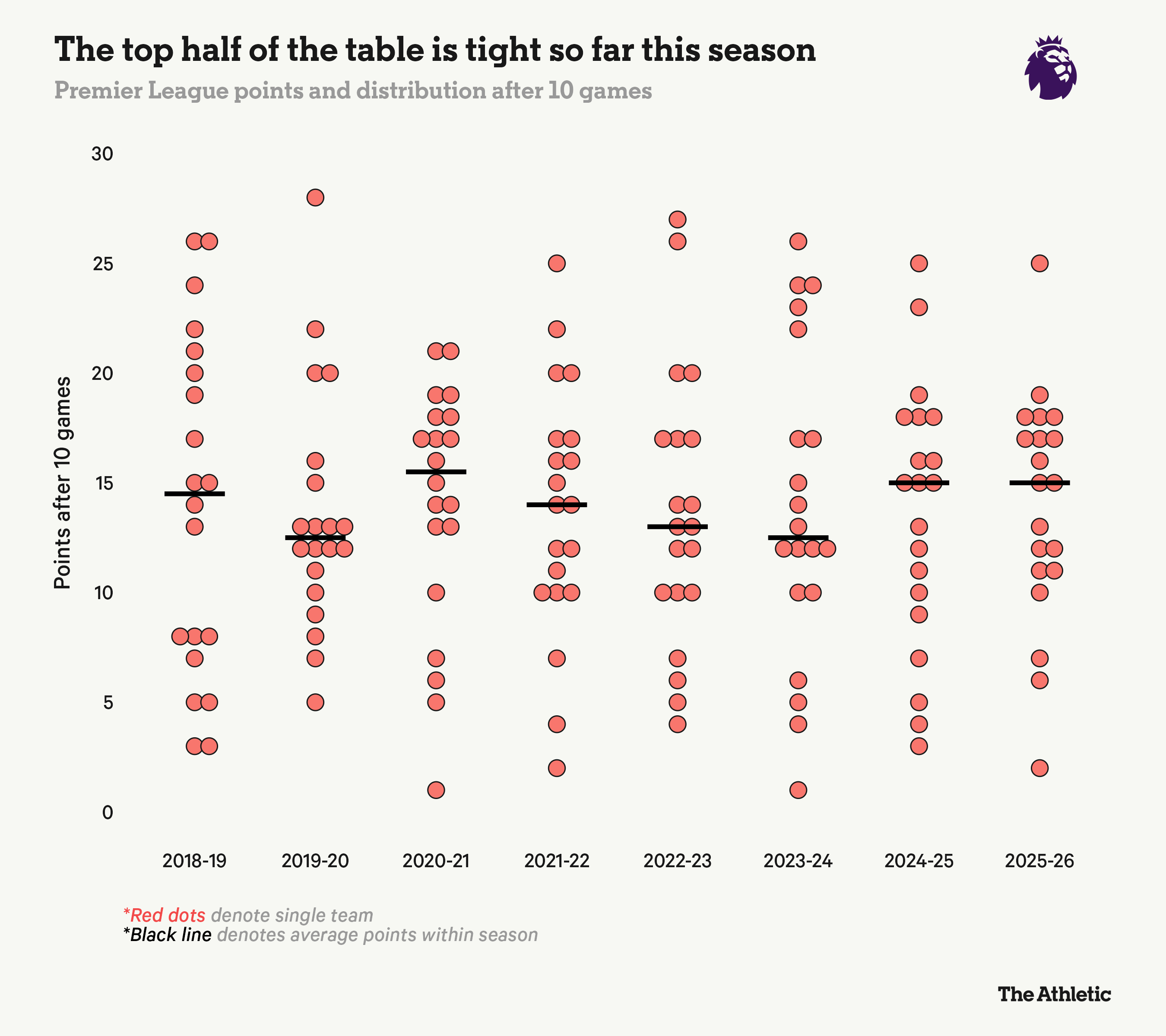 بالنسبة لأولئك الذين لديهم عين إحصائية، فإن الانحراف المعياري – الذي يشير إلى انتشار مجموعة البيانات – هو الأصغر منذ 2018-2019 في هذه المرحلة من الموسم.