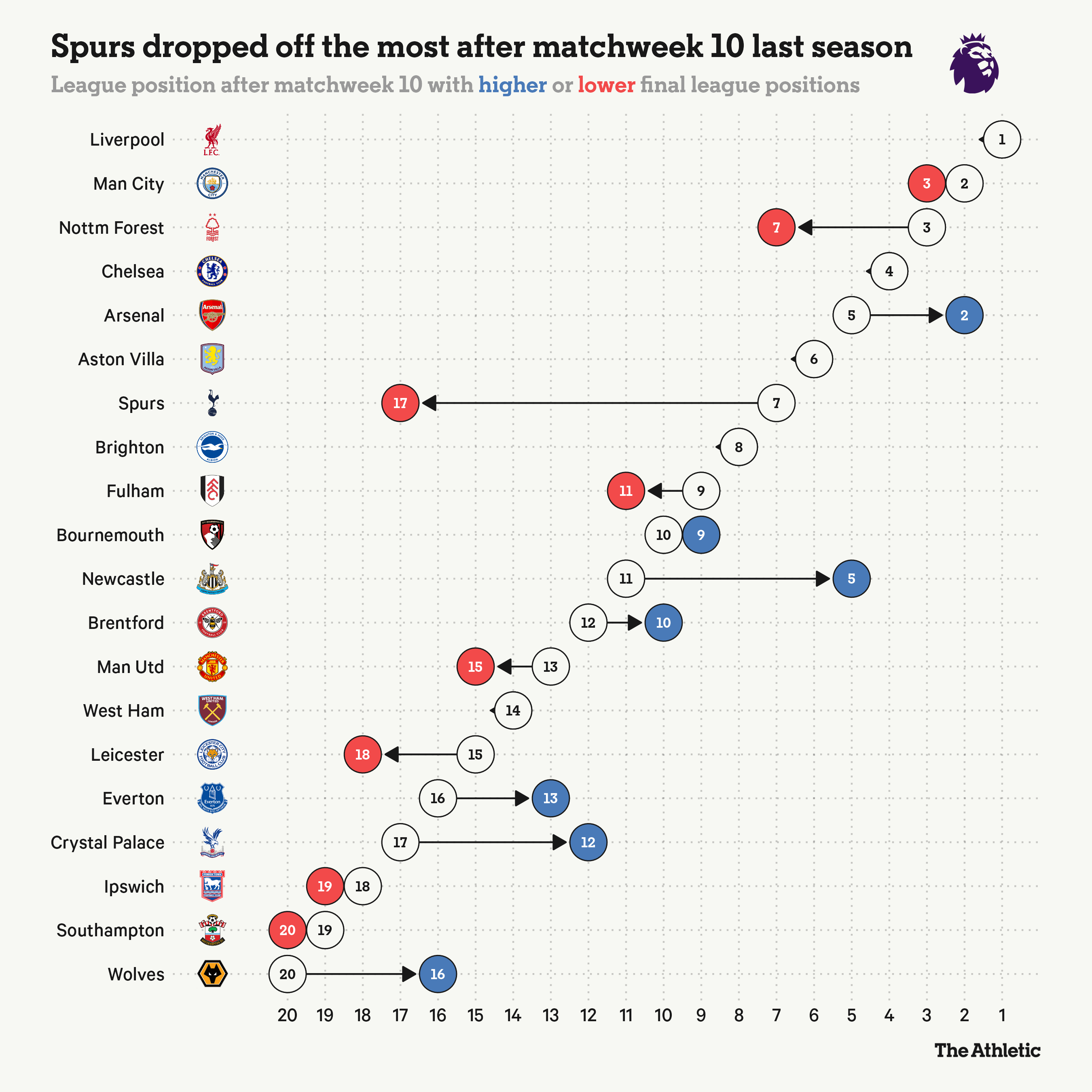 كان اللاعبون الذين شهدوا أكبر تراجع في الموسم الماضي هم بلا شك توتنهام هوتسبير. بغض النظر عن الإصابات وسلة البيض في الدوري الأوروبي، كان التراجع بمقدار 10 مراكز في الدوري من نوفمبر إلى مايو هو الأكبر من أي فريق في موسم 2024-2025. لقد فازوا باللقب الأوروبي، لكن تعثرهم في الدوري المحلي كلف أنجي بوستيكوجلو وظيفته.