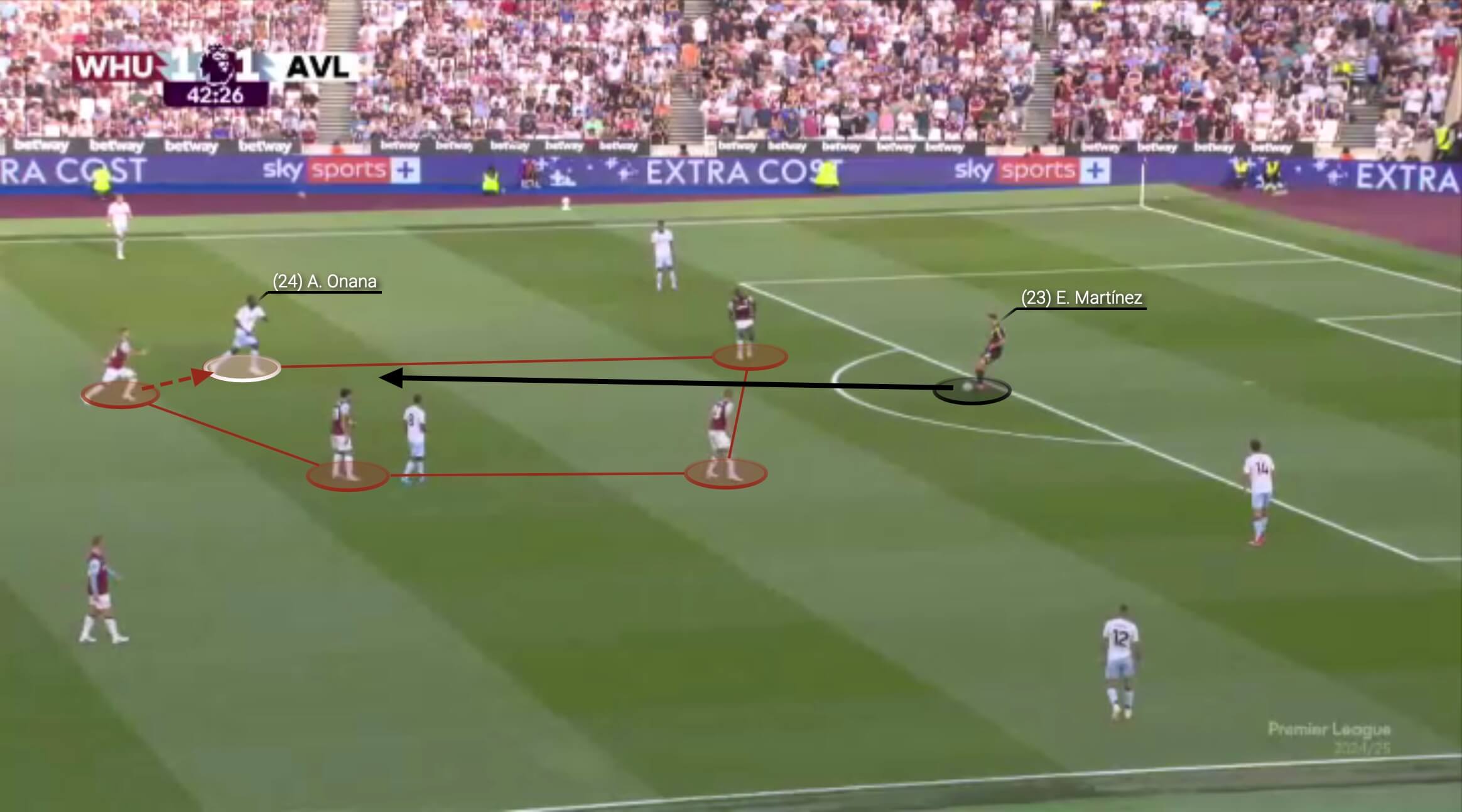 وأصبحت قدرة أونانا على الاختراق إلى ما وراء خط الوسط واضحة، حيث تمكن من تنفيذ تحركات ثالثة وقيادة التحولات.